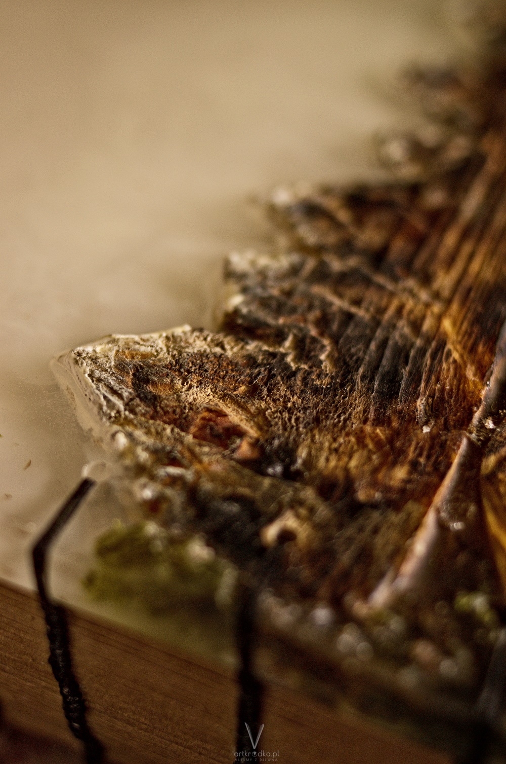 Całość zszyta ręcznie. Każda karta została przyszyta oddzielnie.