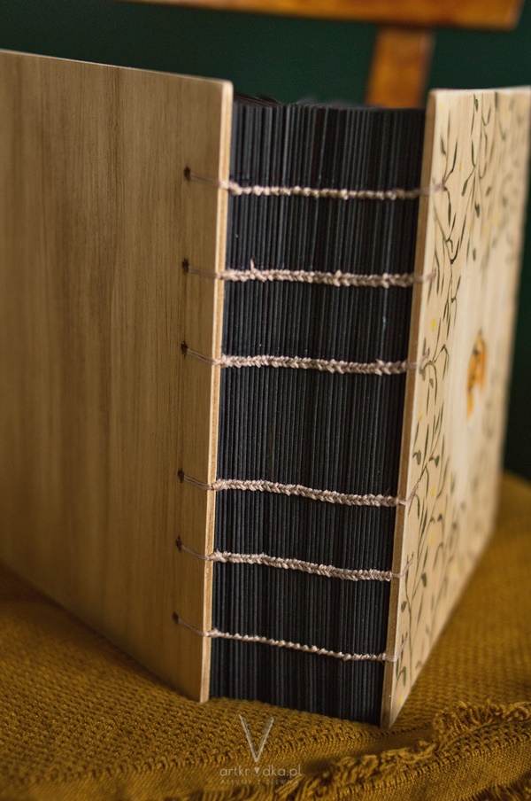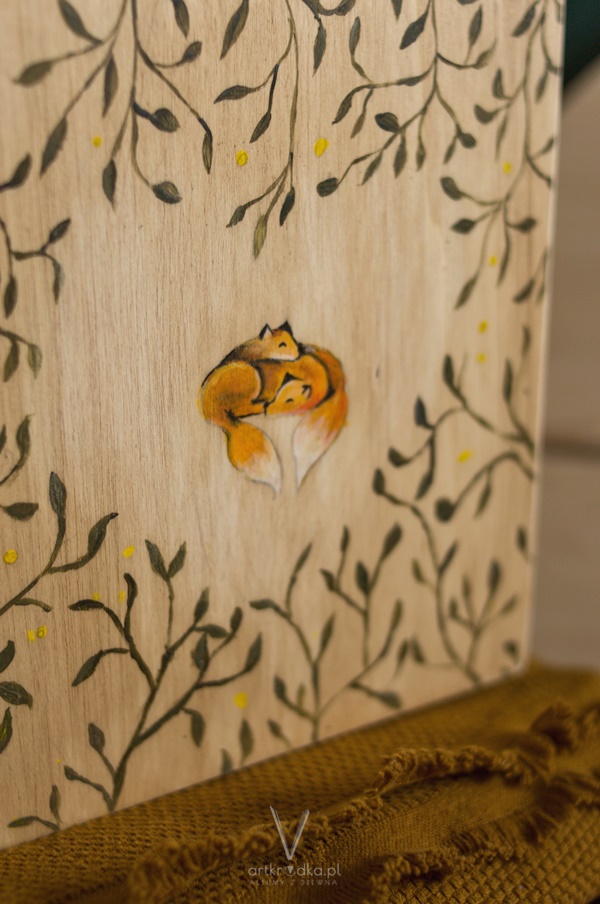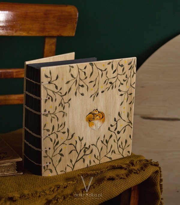 Album w jasnej, drewnianej oprawie z ręcznie malowanymi liskami.