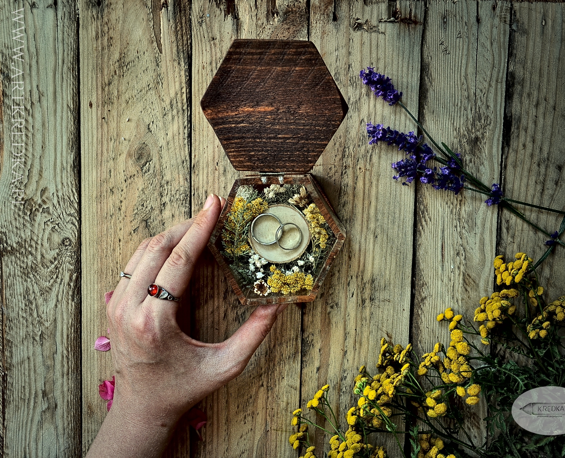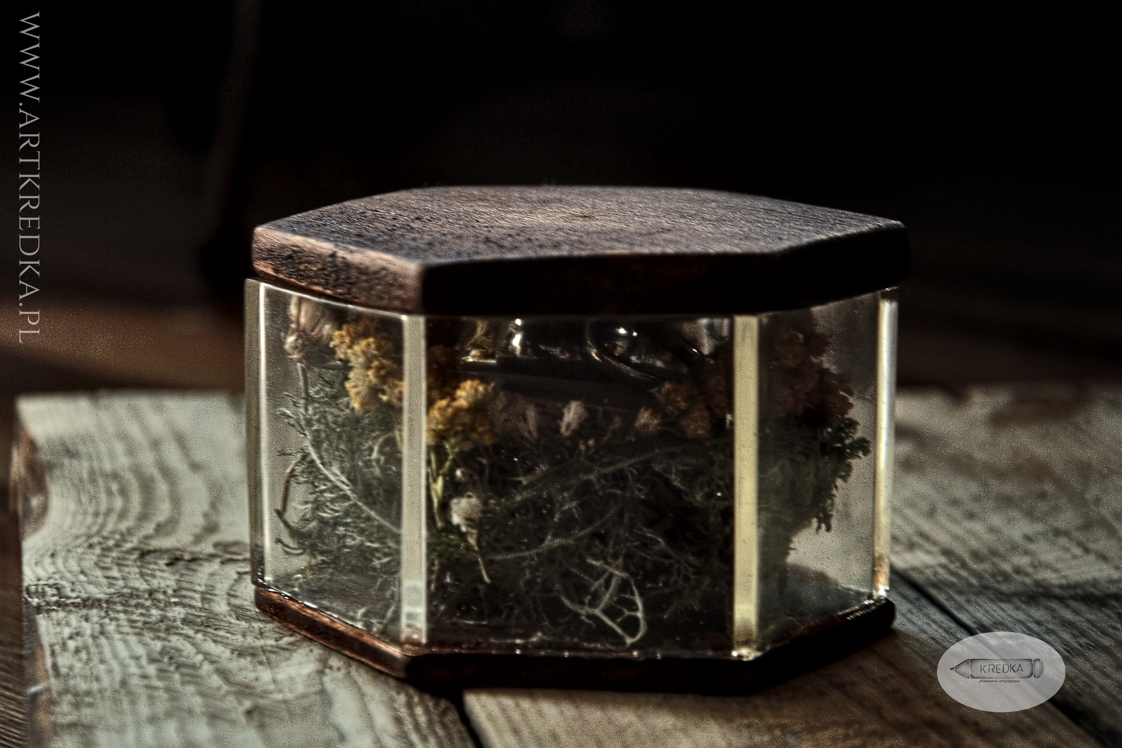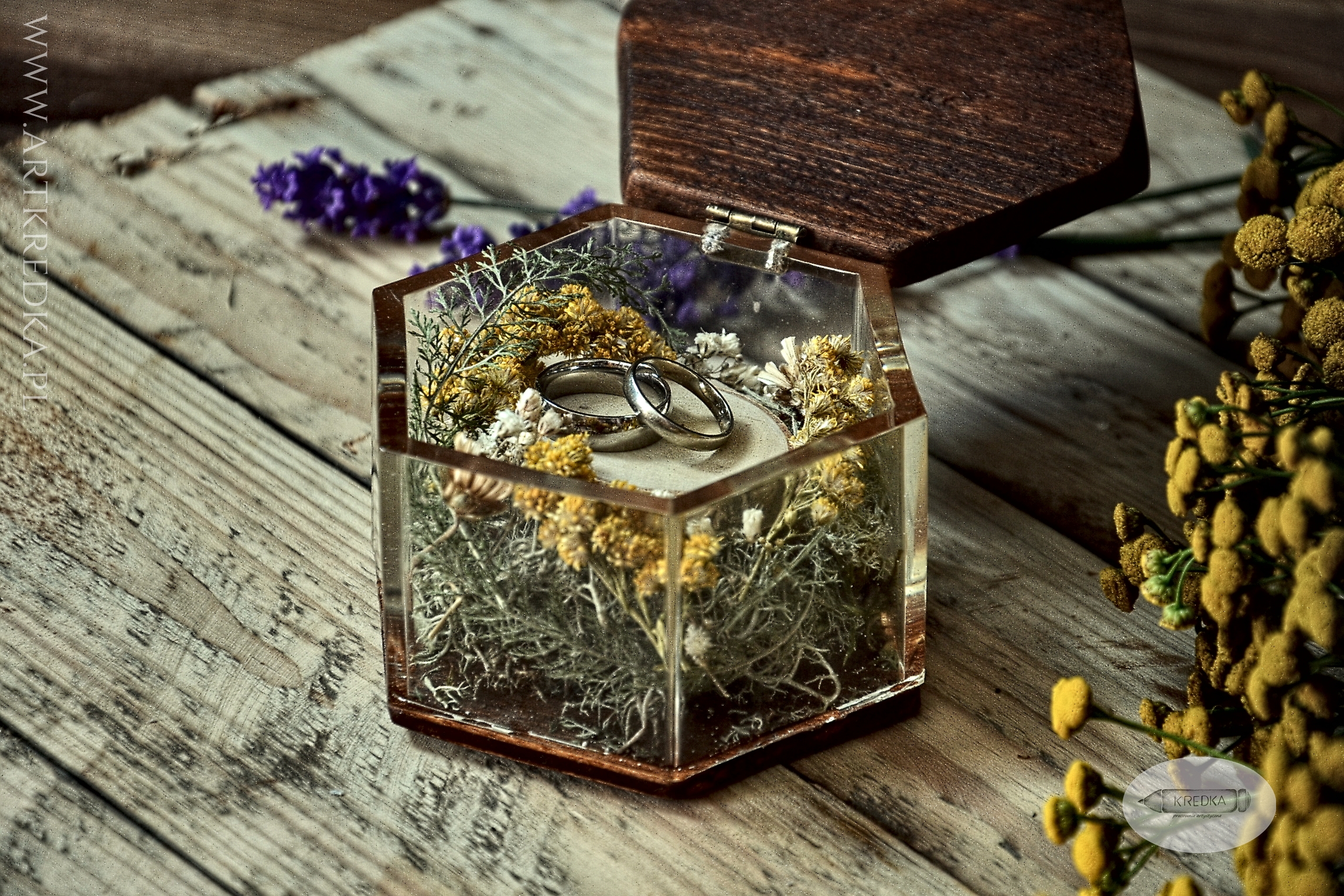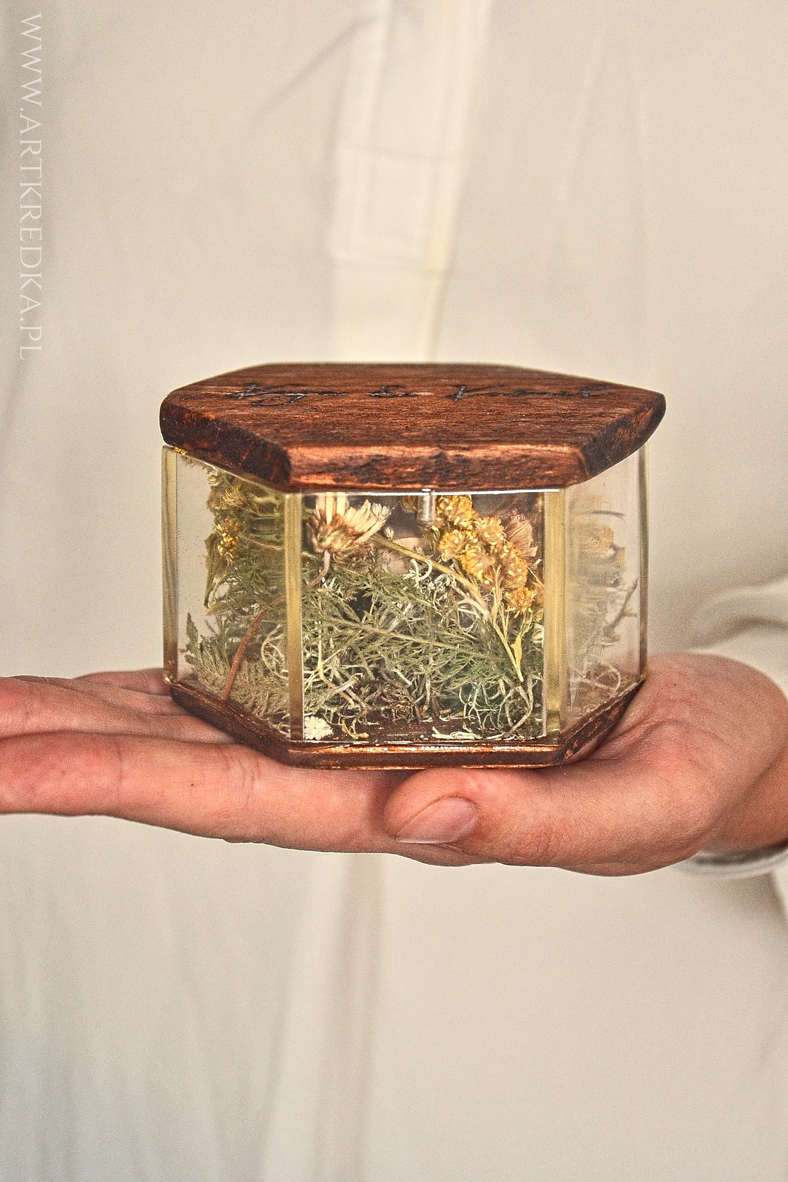 To pudełko to połączenie drewna, żywicy i suszonych kwiatów. Do tego kształt heksagonu.