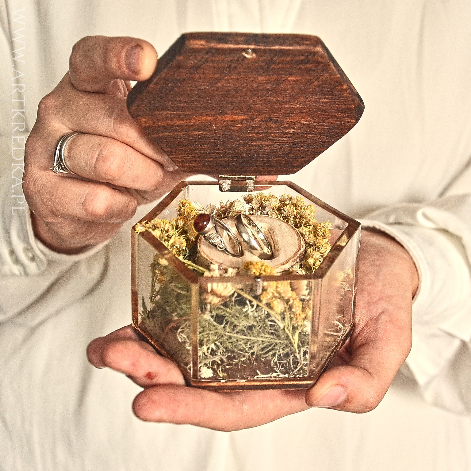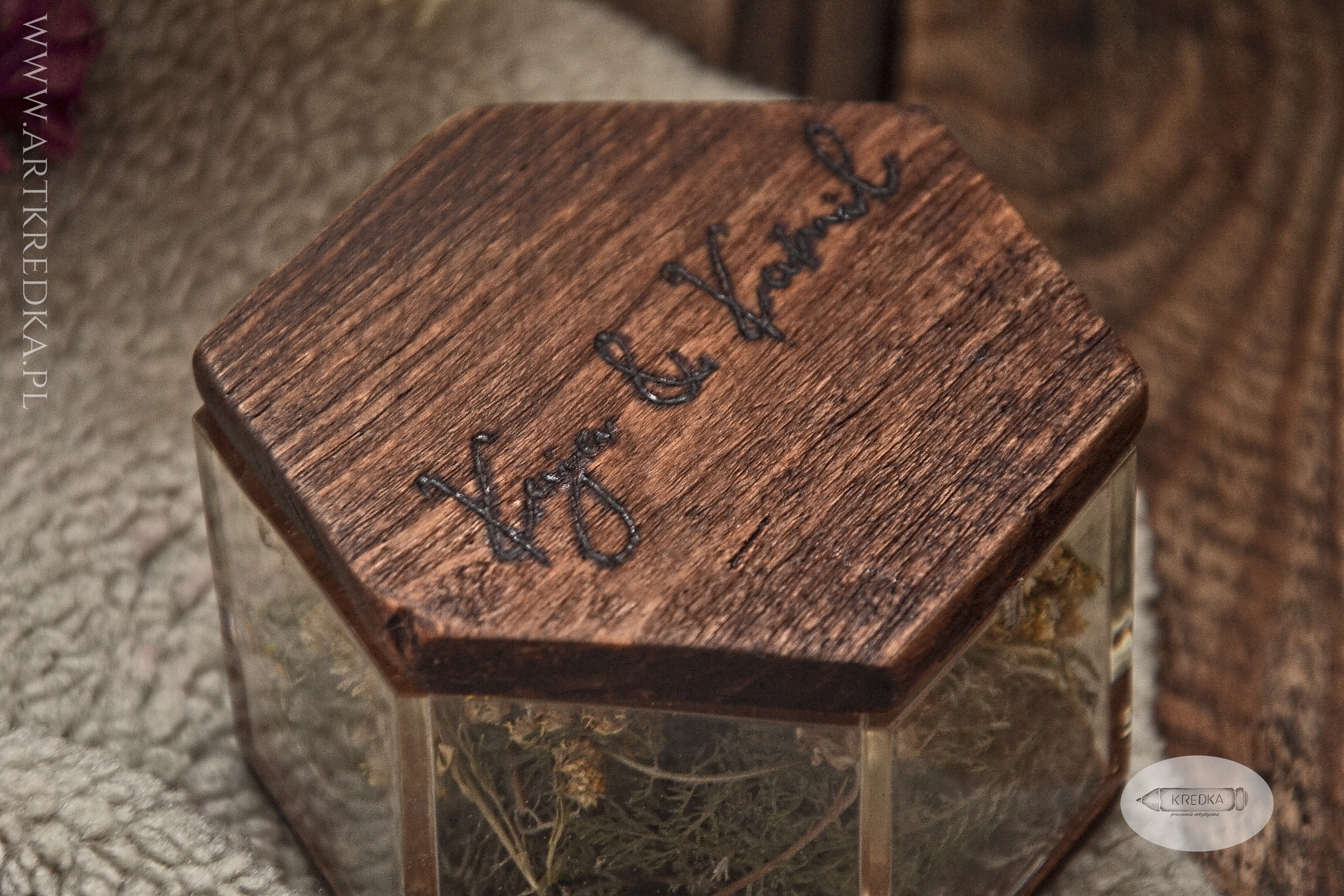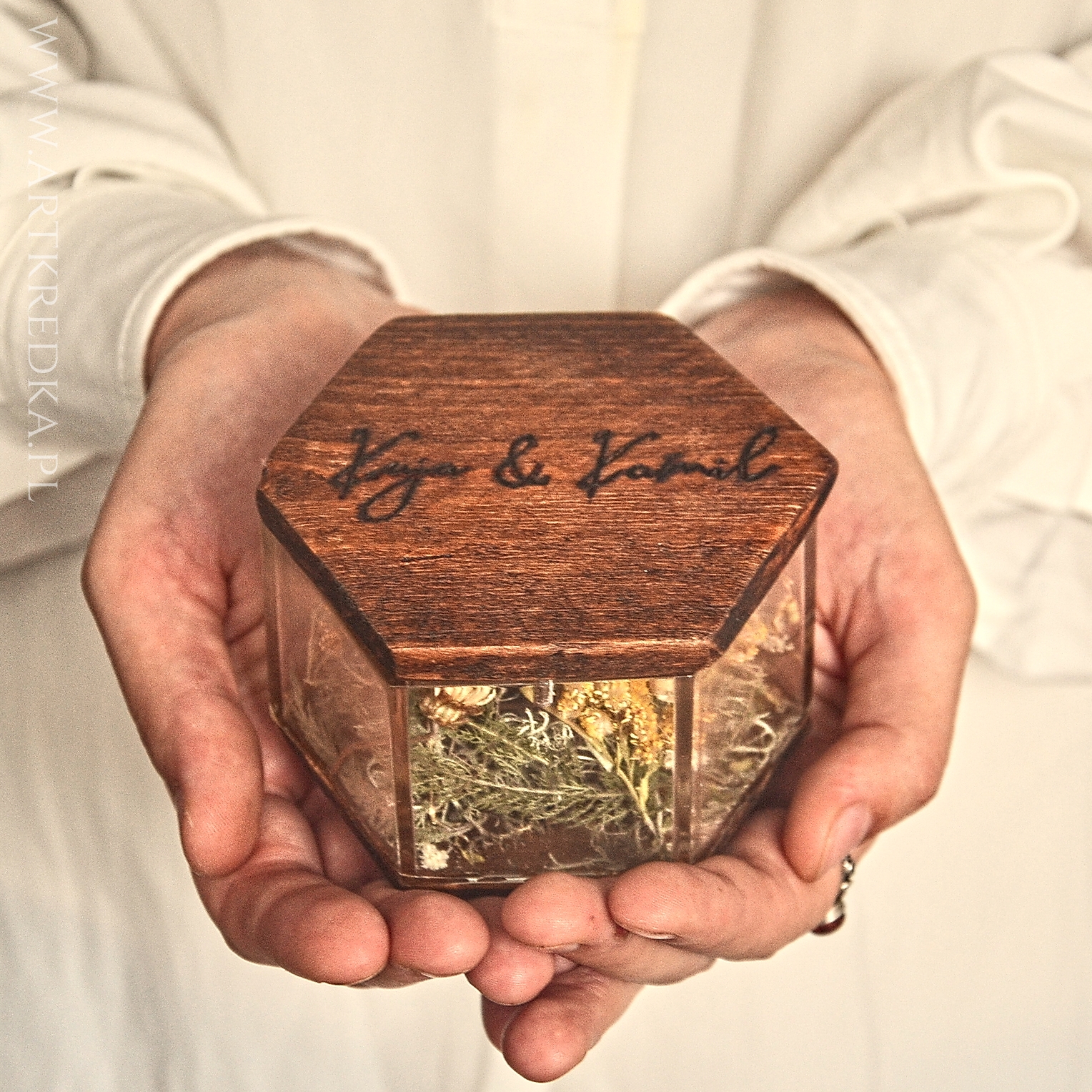 To pudełko to połączenie drewna, żywicy i suszonych kwiatów. Do tego kształt heksagonu.