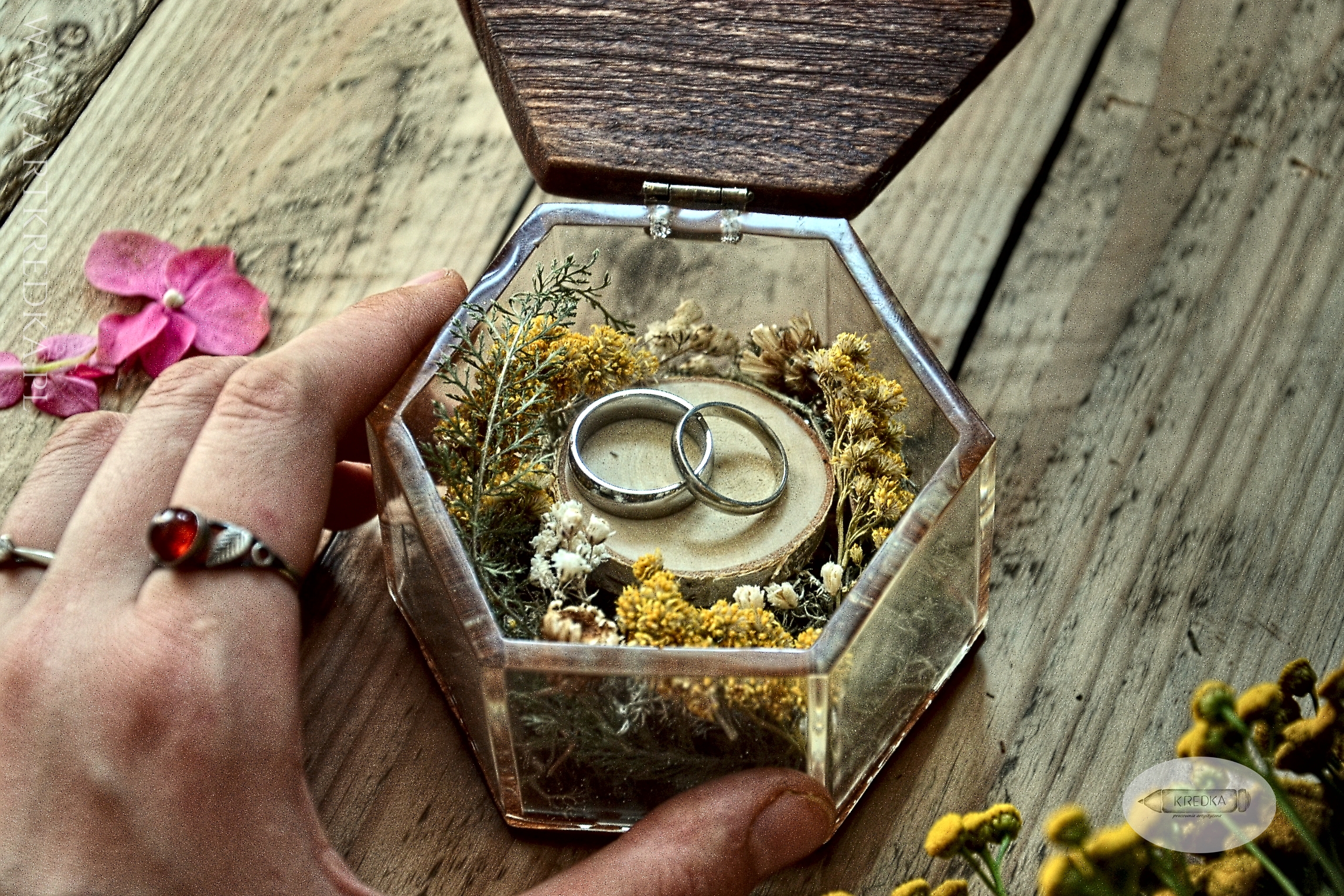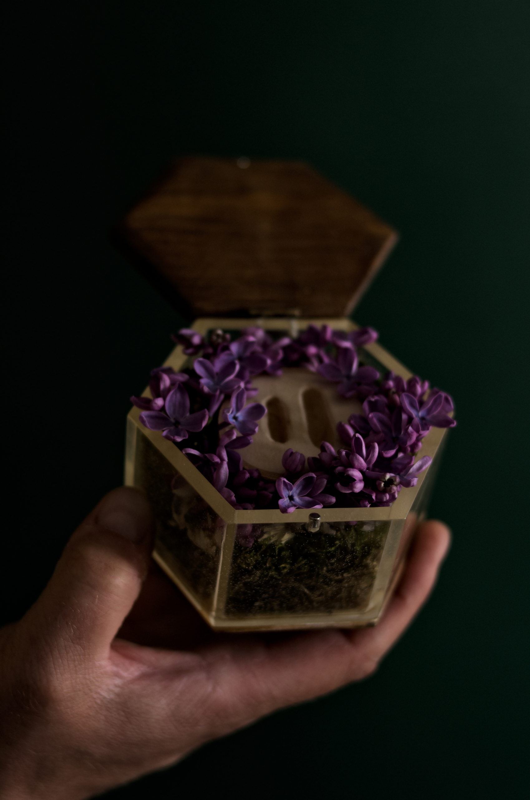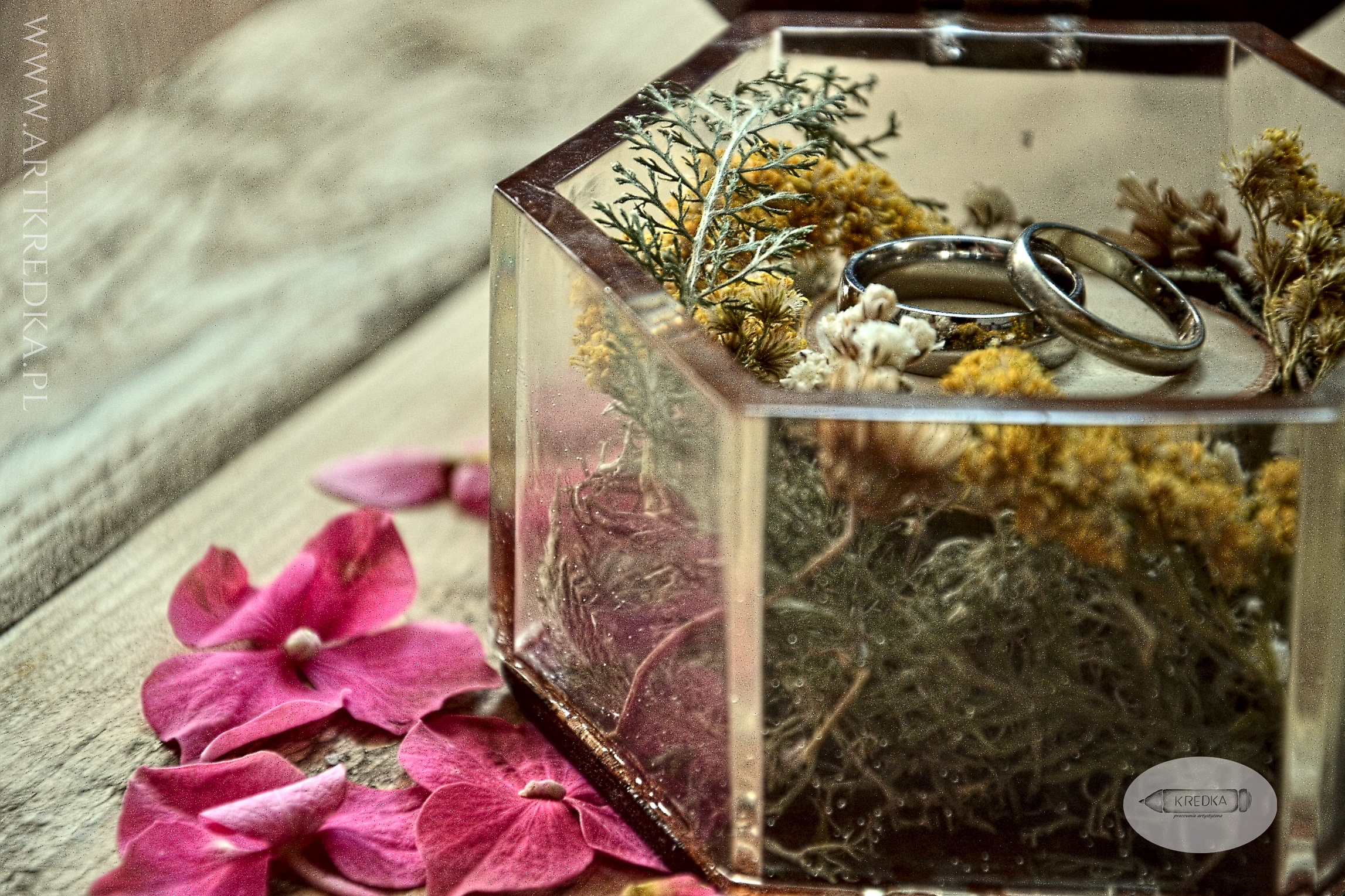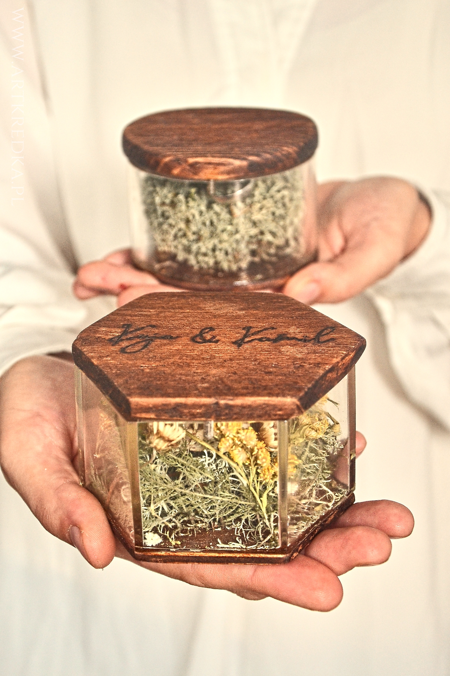To pudełko to połączenie drewna, żywicy i suszonych kwiatów. Do tego kształt heksagonu.