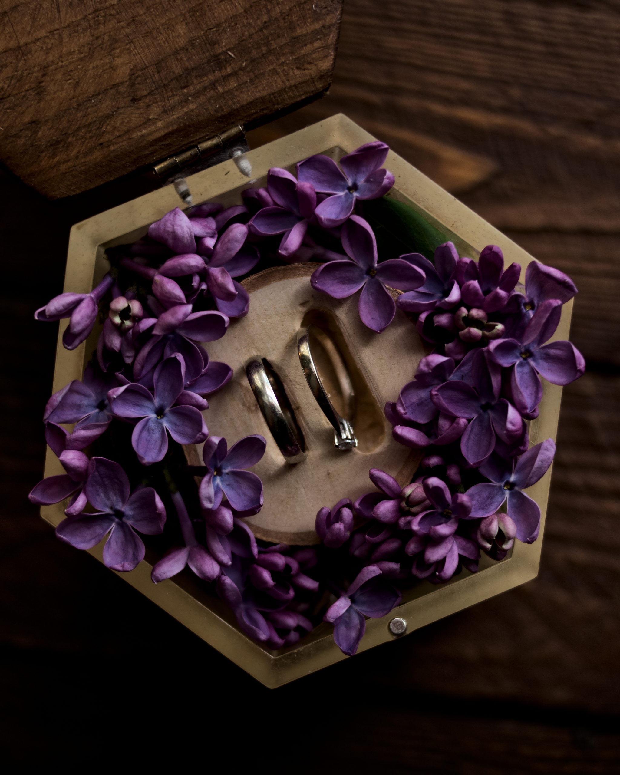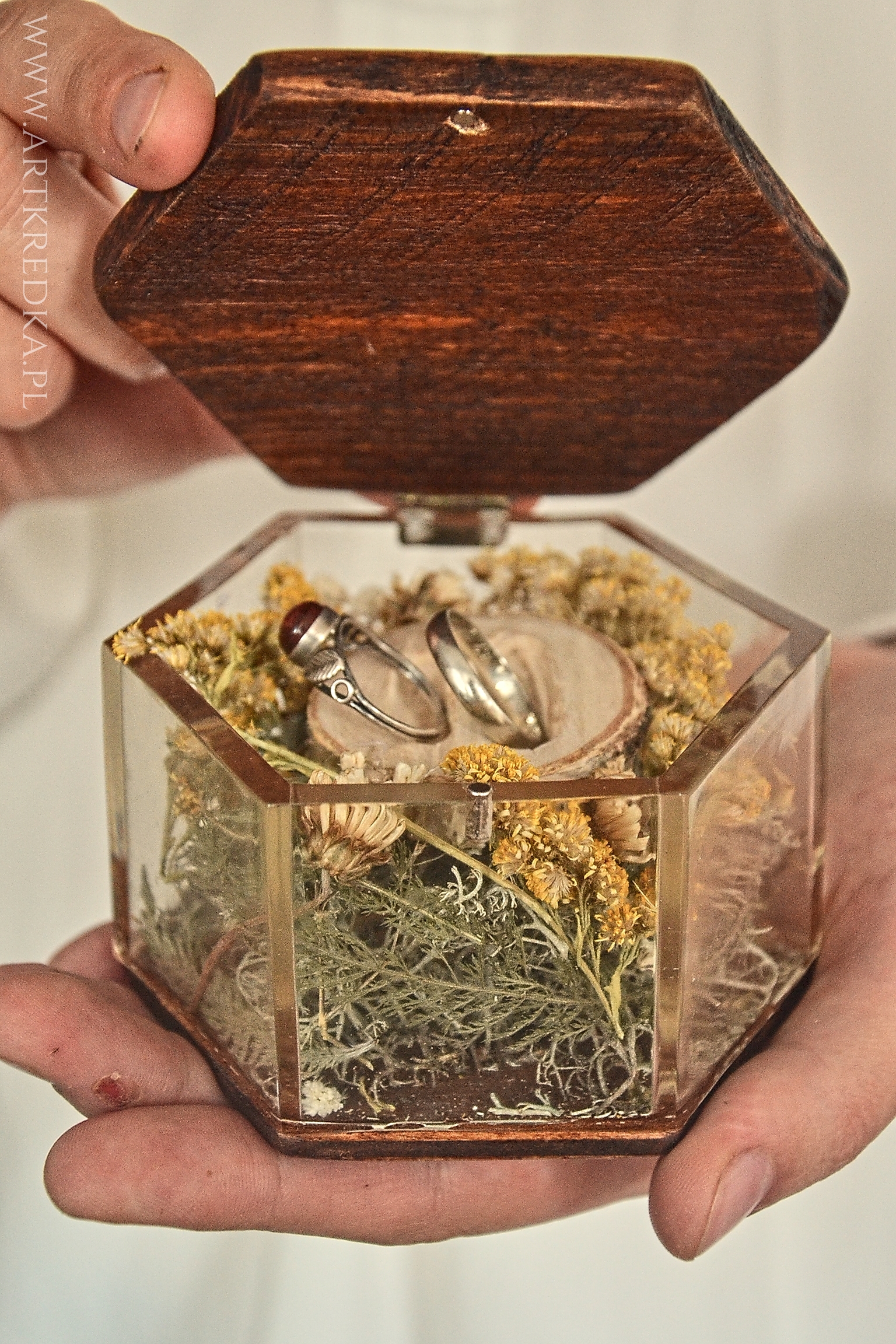 W środku możesz wybrać same kwiaty lub drewniany krążek z miejsce na obrączki.