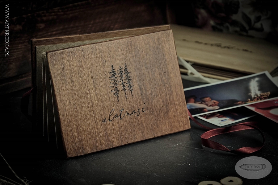 Album harmonijkowy w drewnianej oprawie, z ręcznie wypalaną dekoracją. Zawiązywany bordową wstążką.