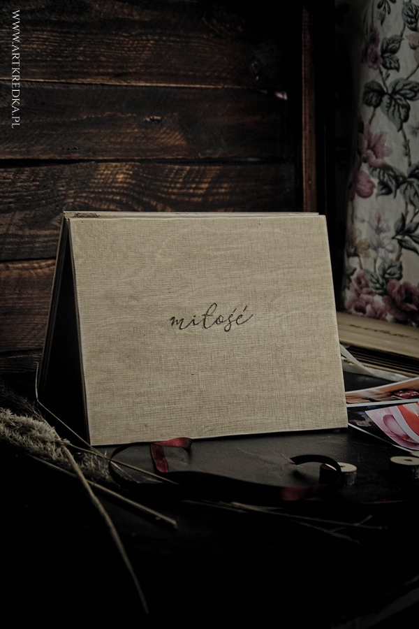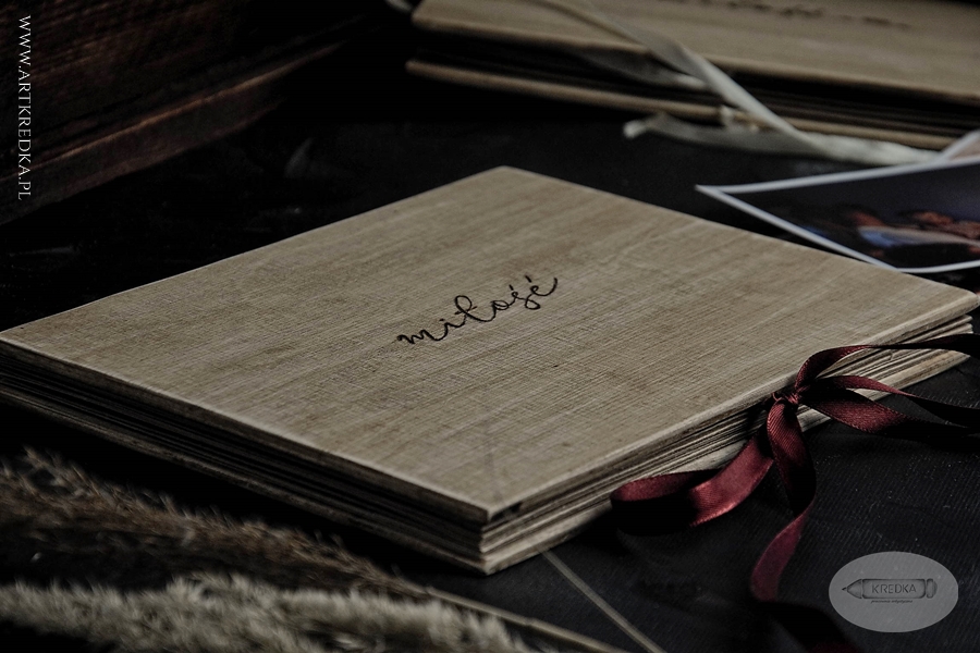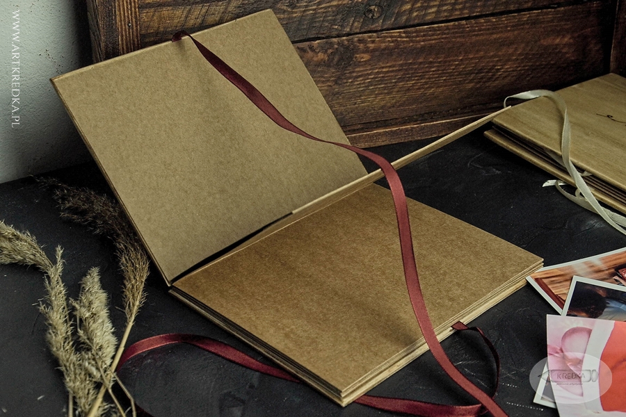 Album harmonijkowy w drewnianej oprawie, z ręcznie wypalaną dekoracją. Zawiązywany bordową wstążką.