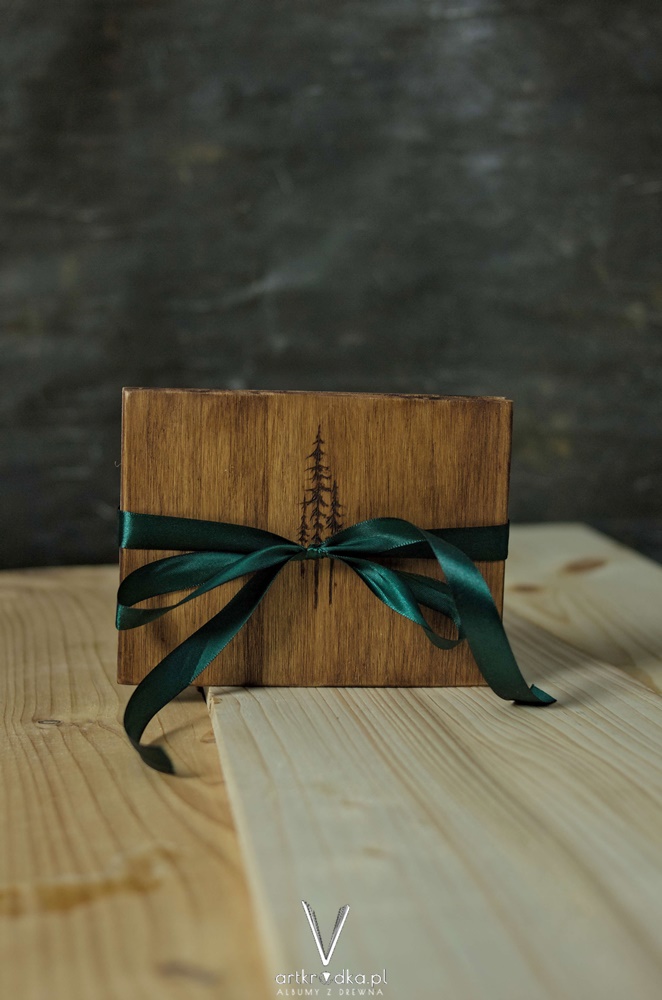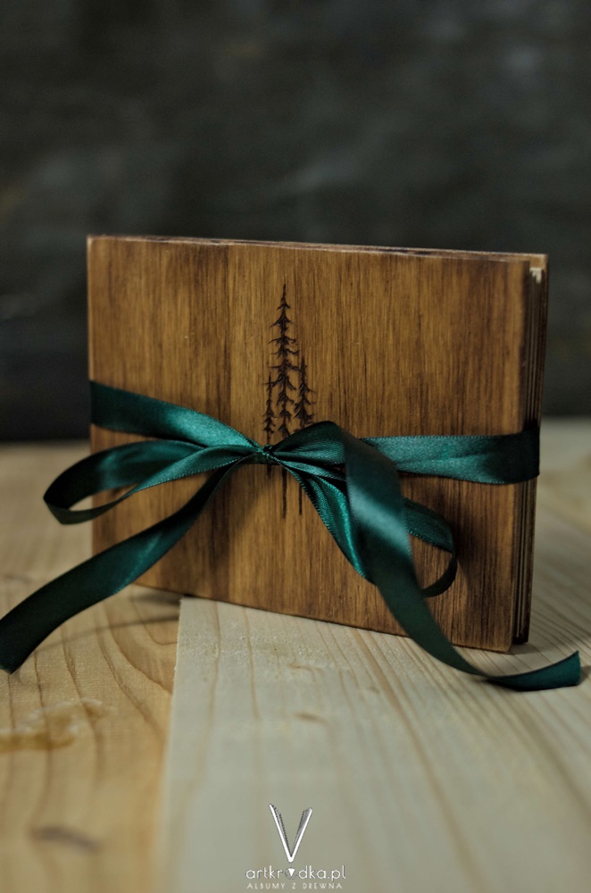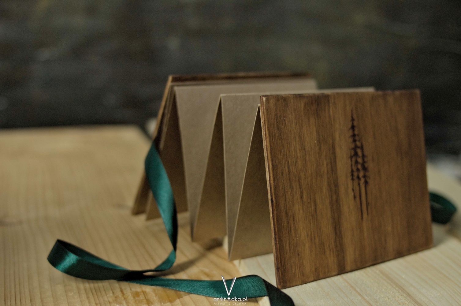 Album harmonijkowy w drewnianej oprawie, z ręcznie wypalaną dekoracją. Zawiązywany ciemnozieloną wstążką.