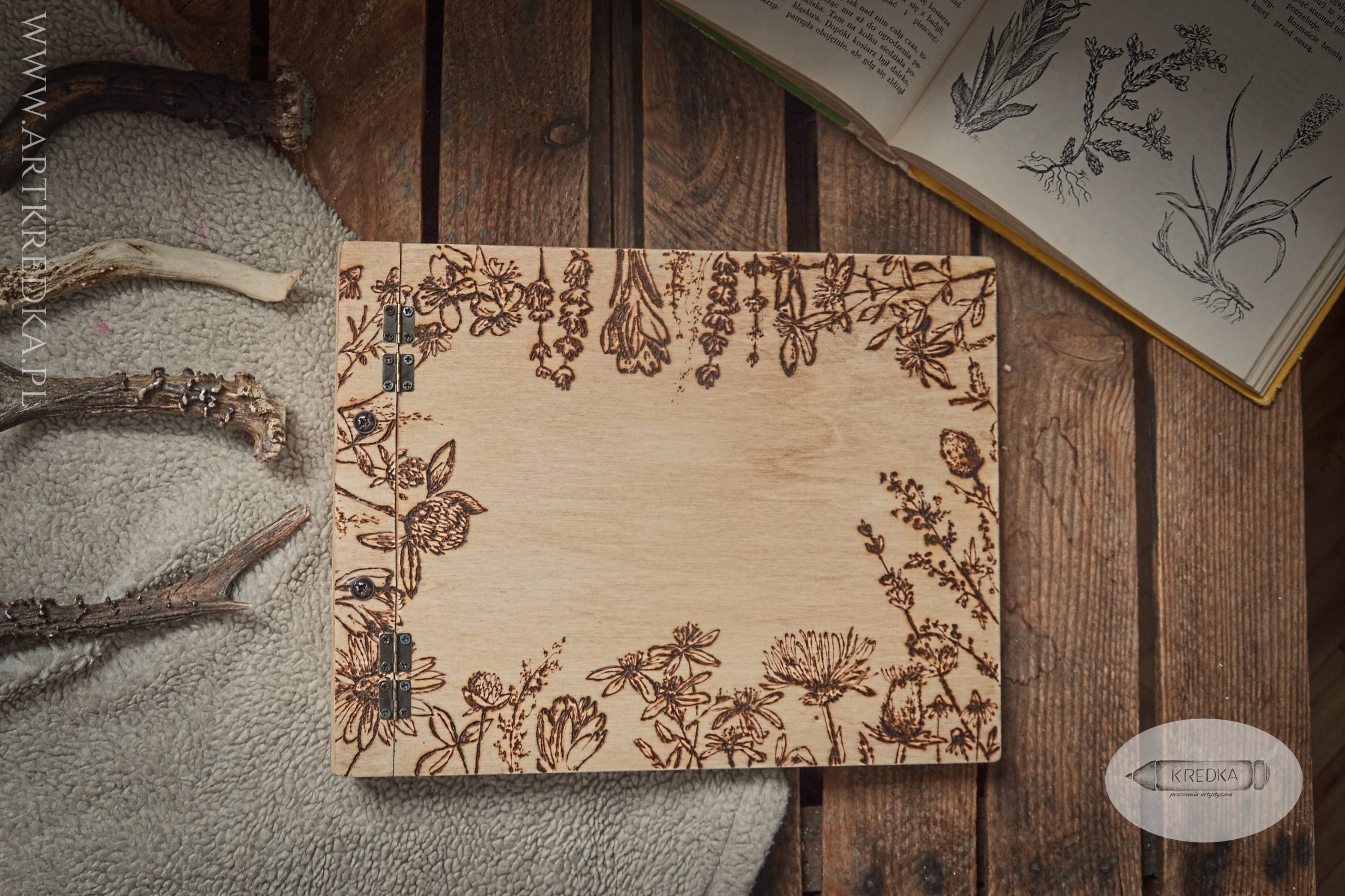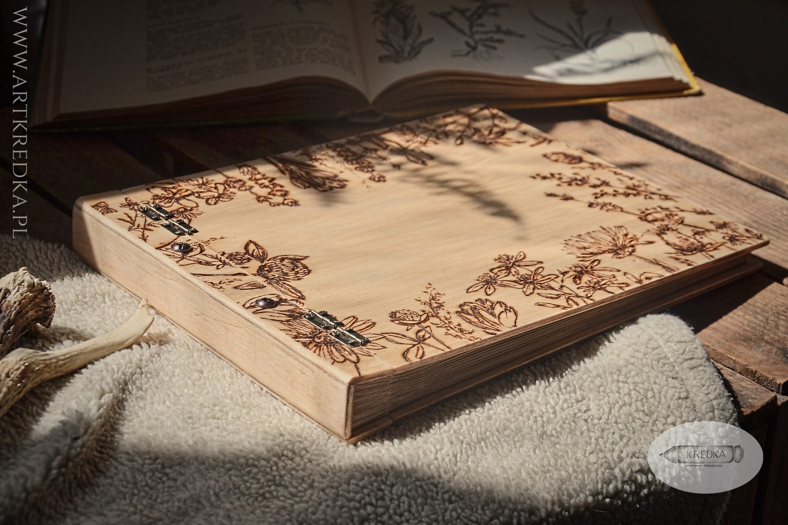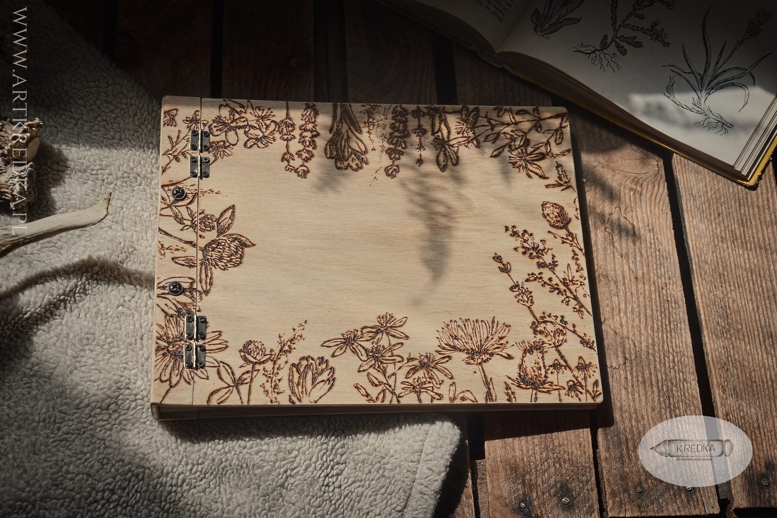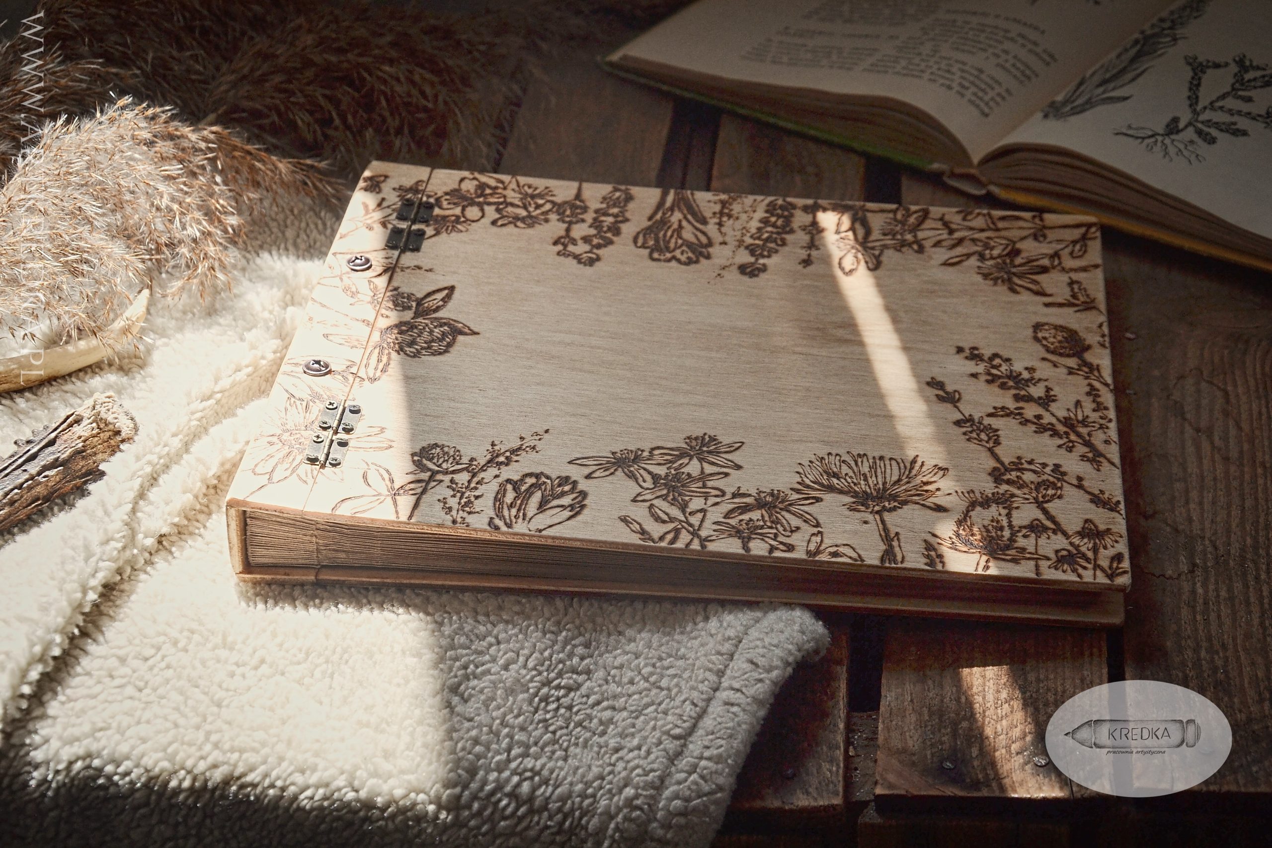 Album na zdjęcia w drewnianej oprawie z ręcznie wypalanym, botanicznym motywem.