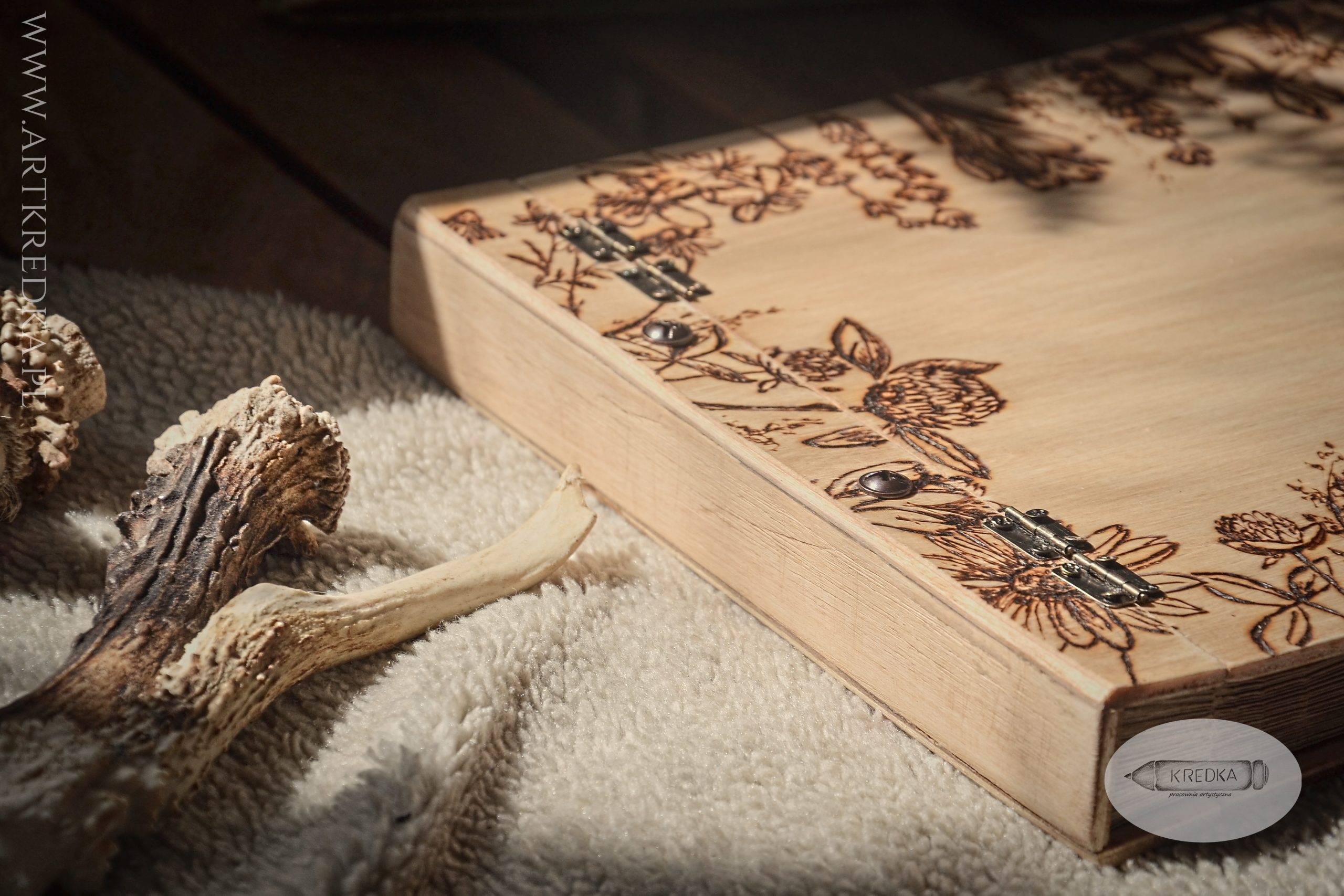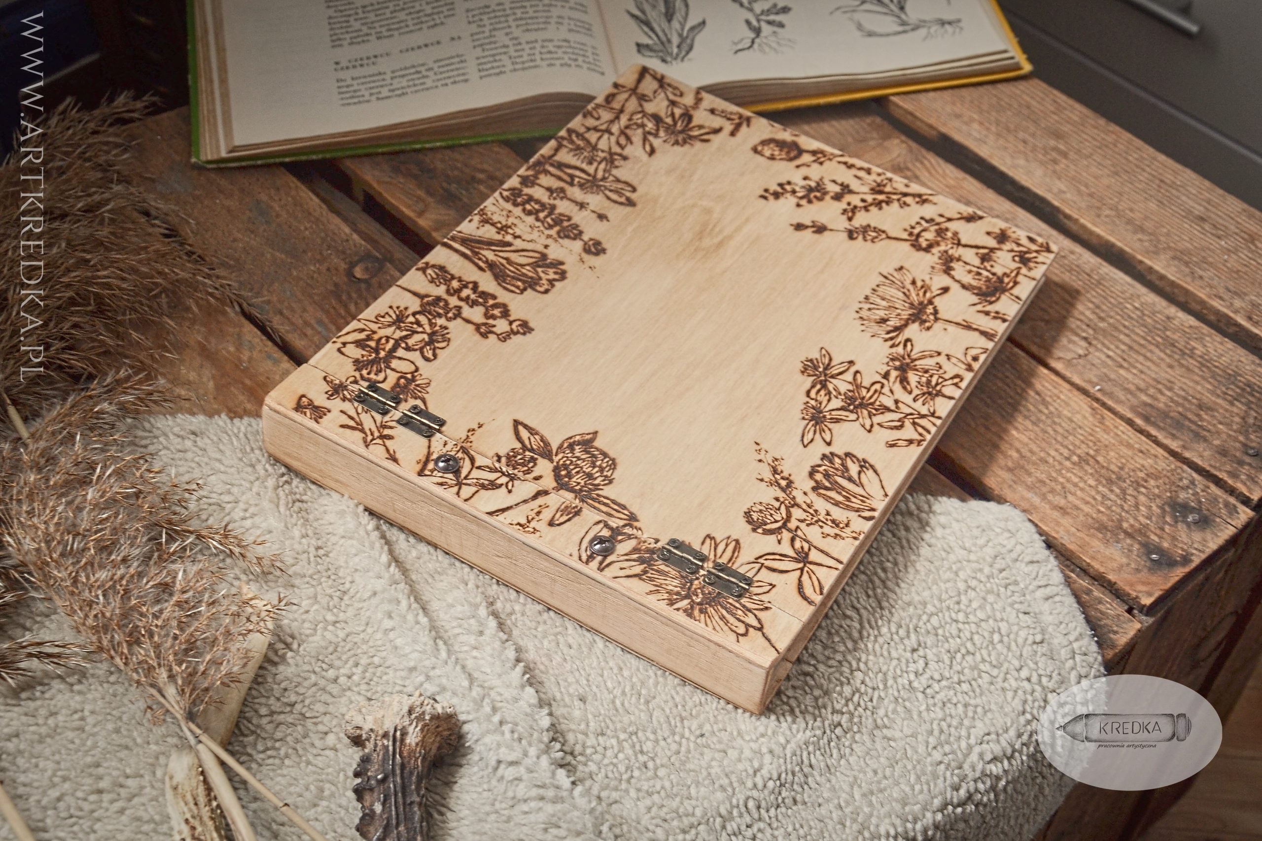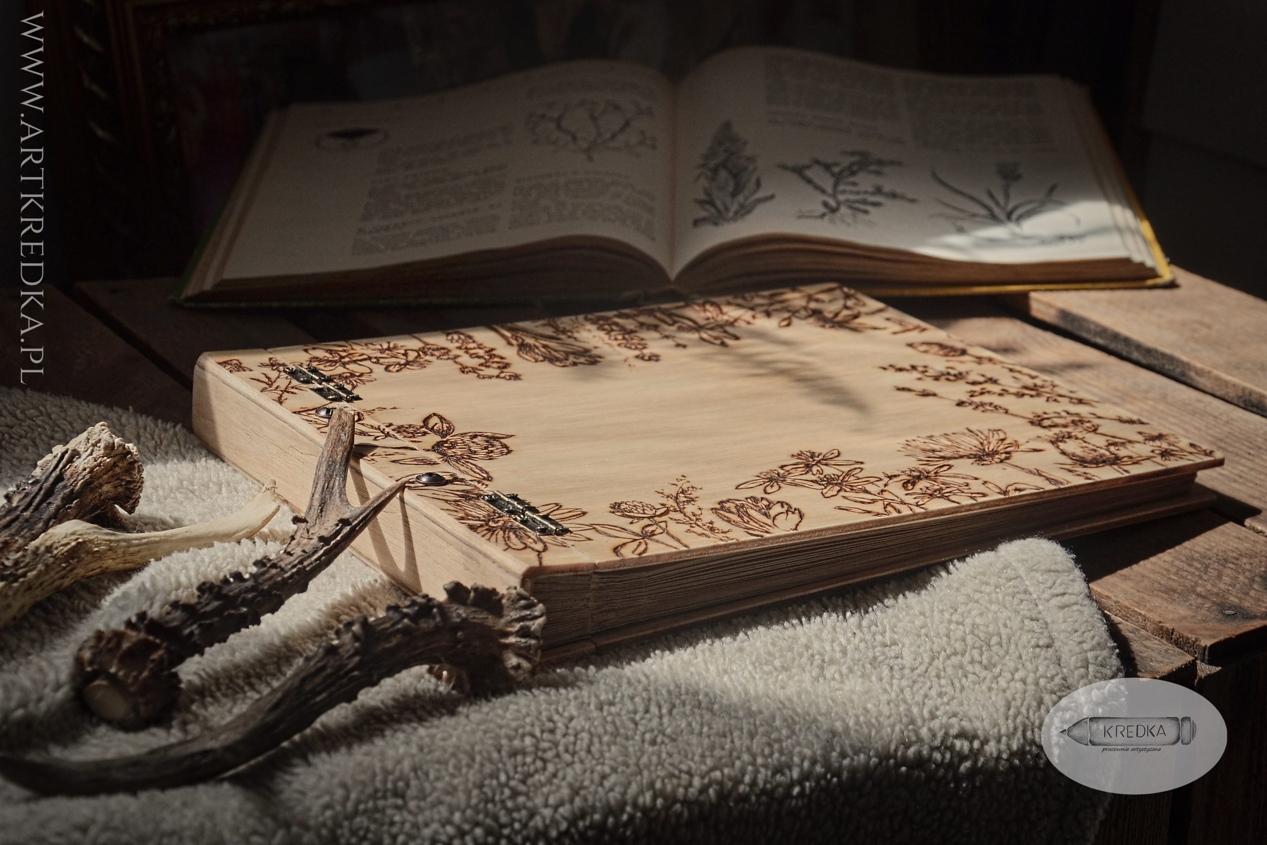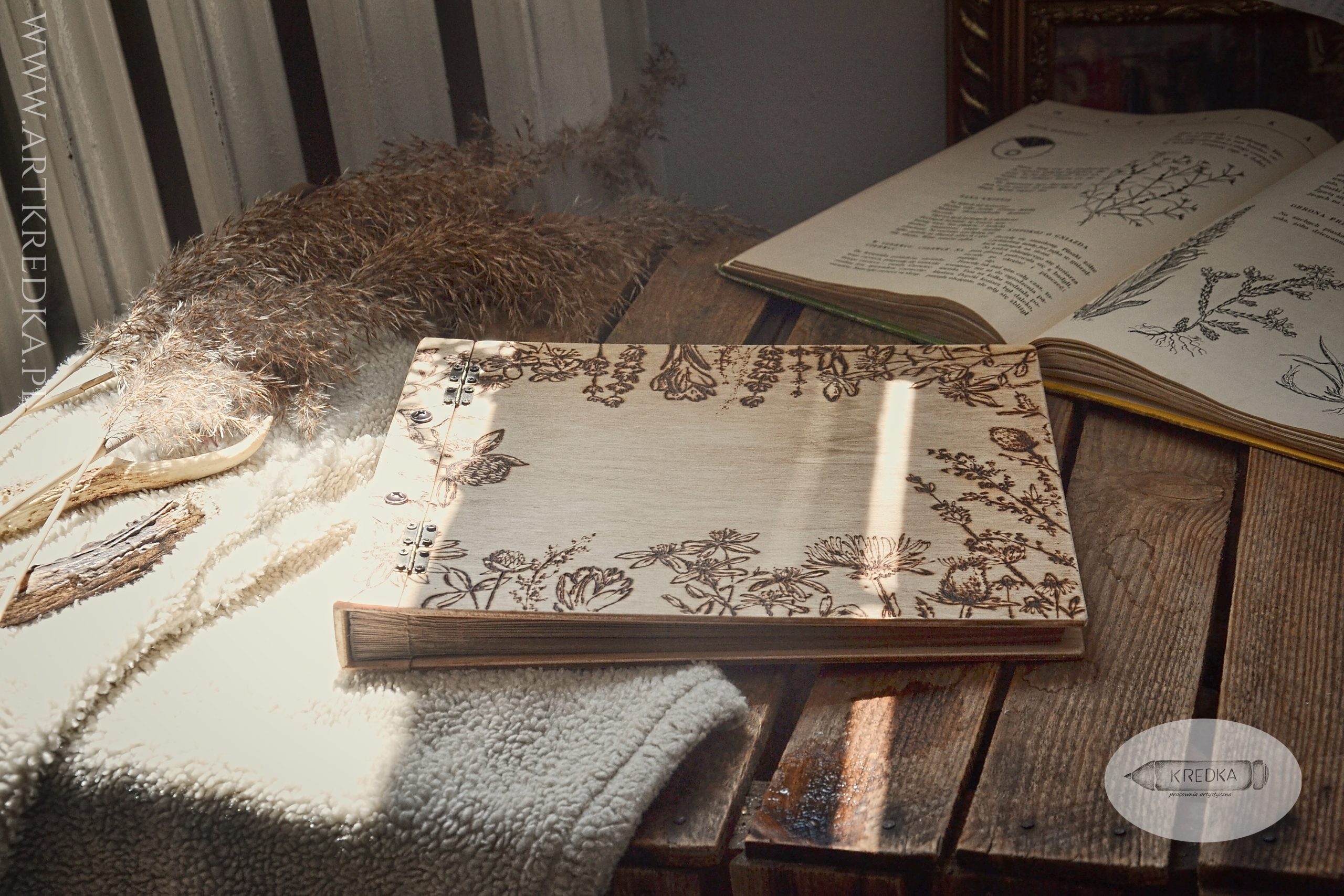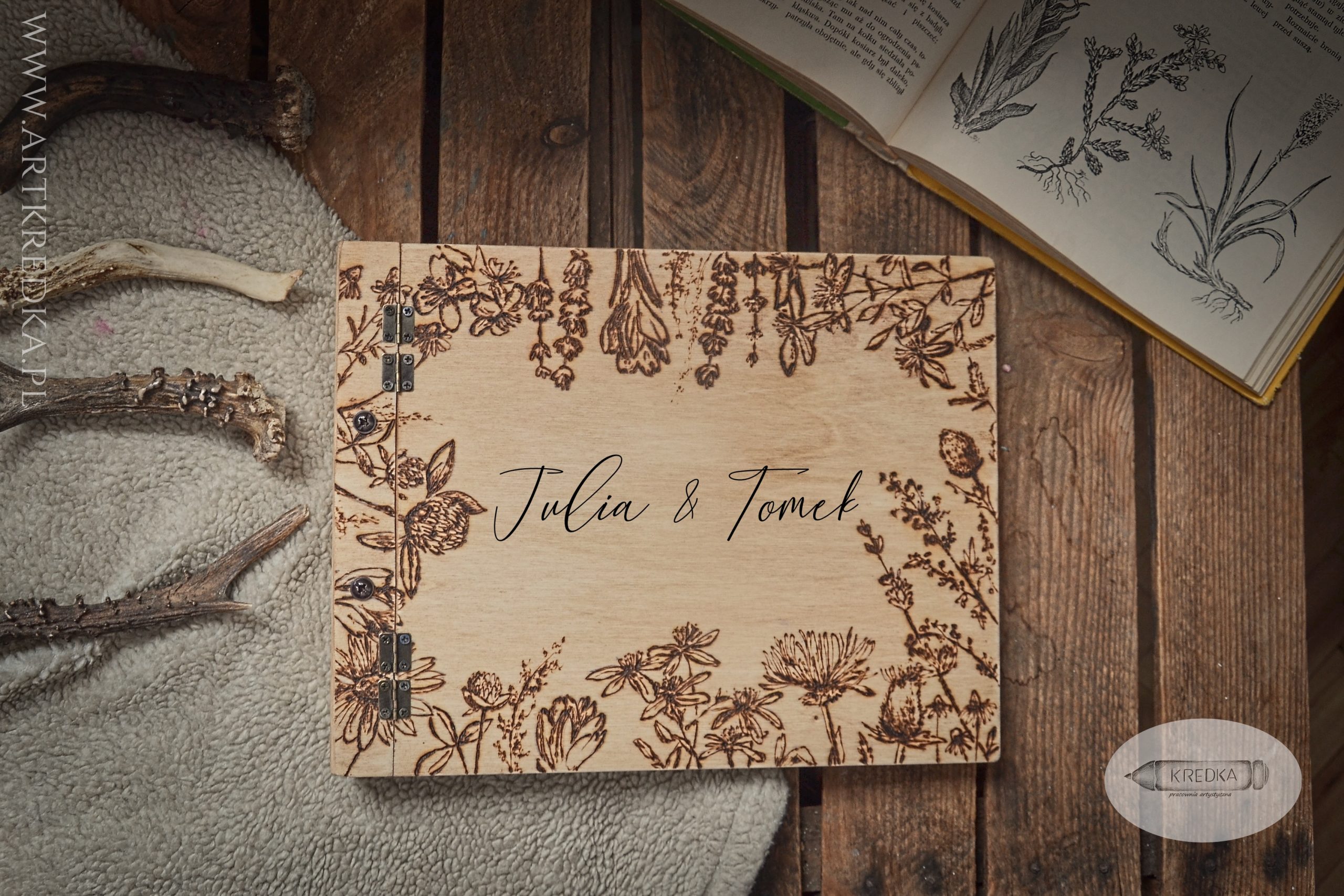 Album na zdjęcia w drewnianej oprawie z ręcznie wypalanym, botanicznym motywem.