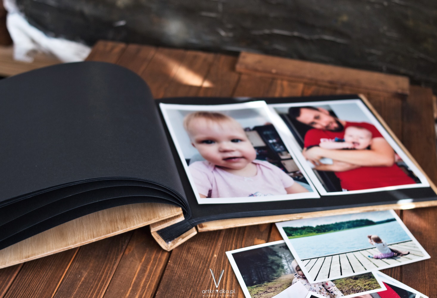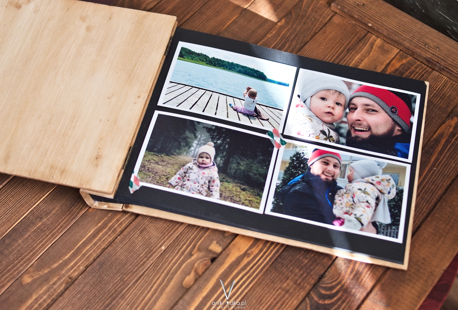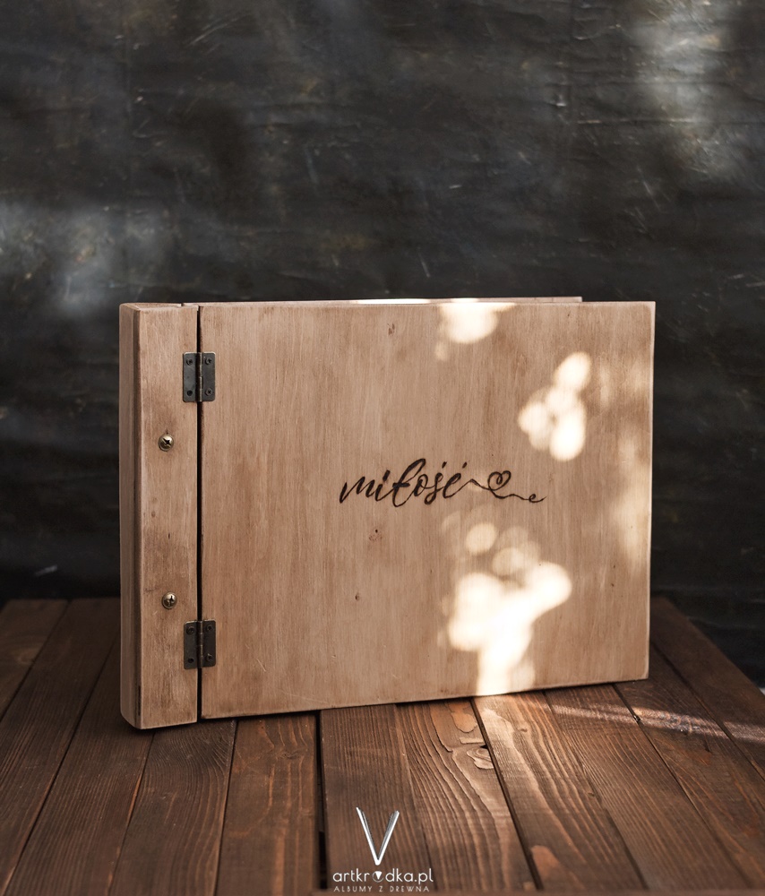 Album na zdjęcia wklejane w drewnianej oprawie, otwierany na zawiasy.