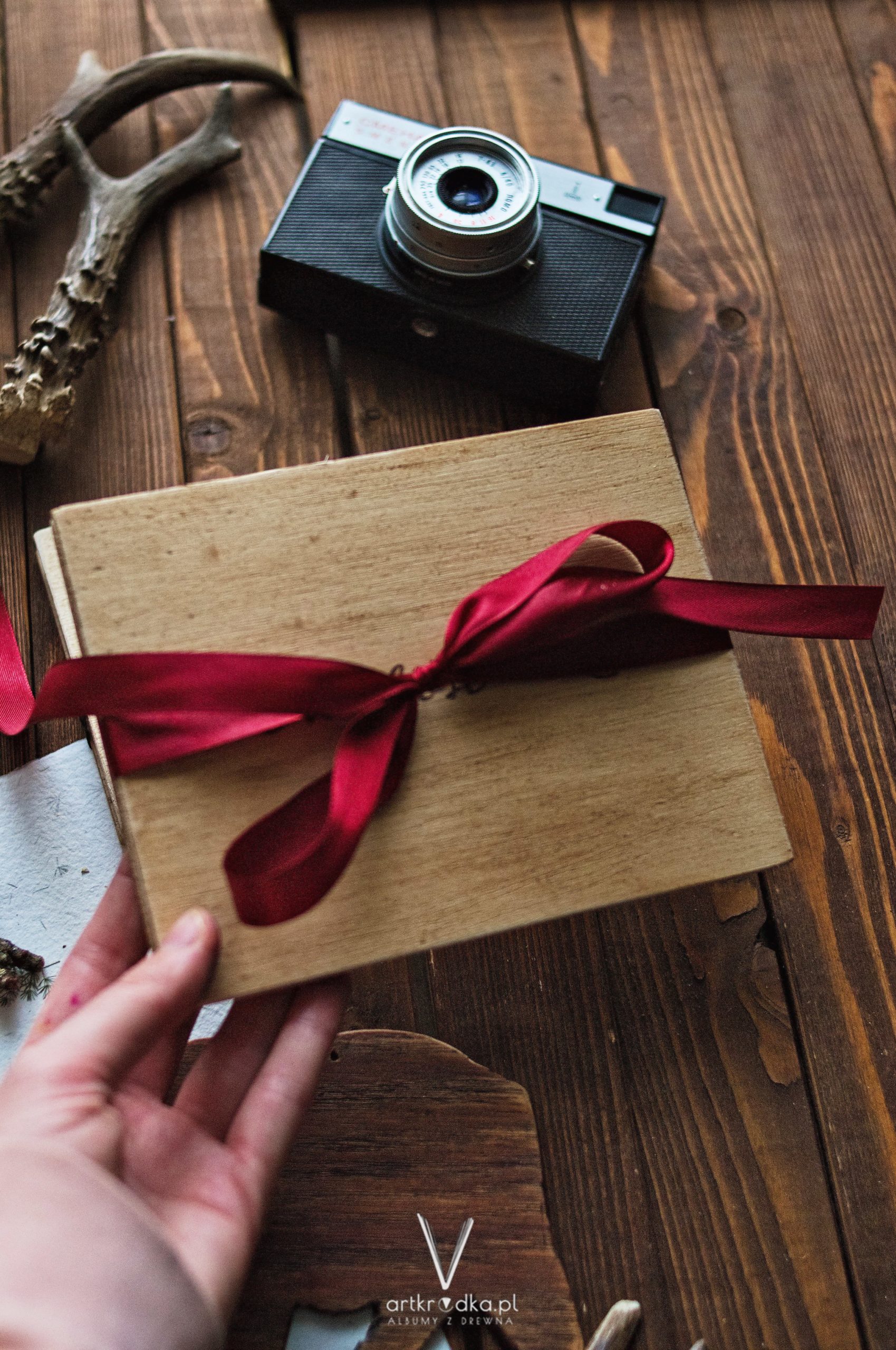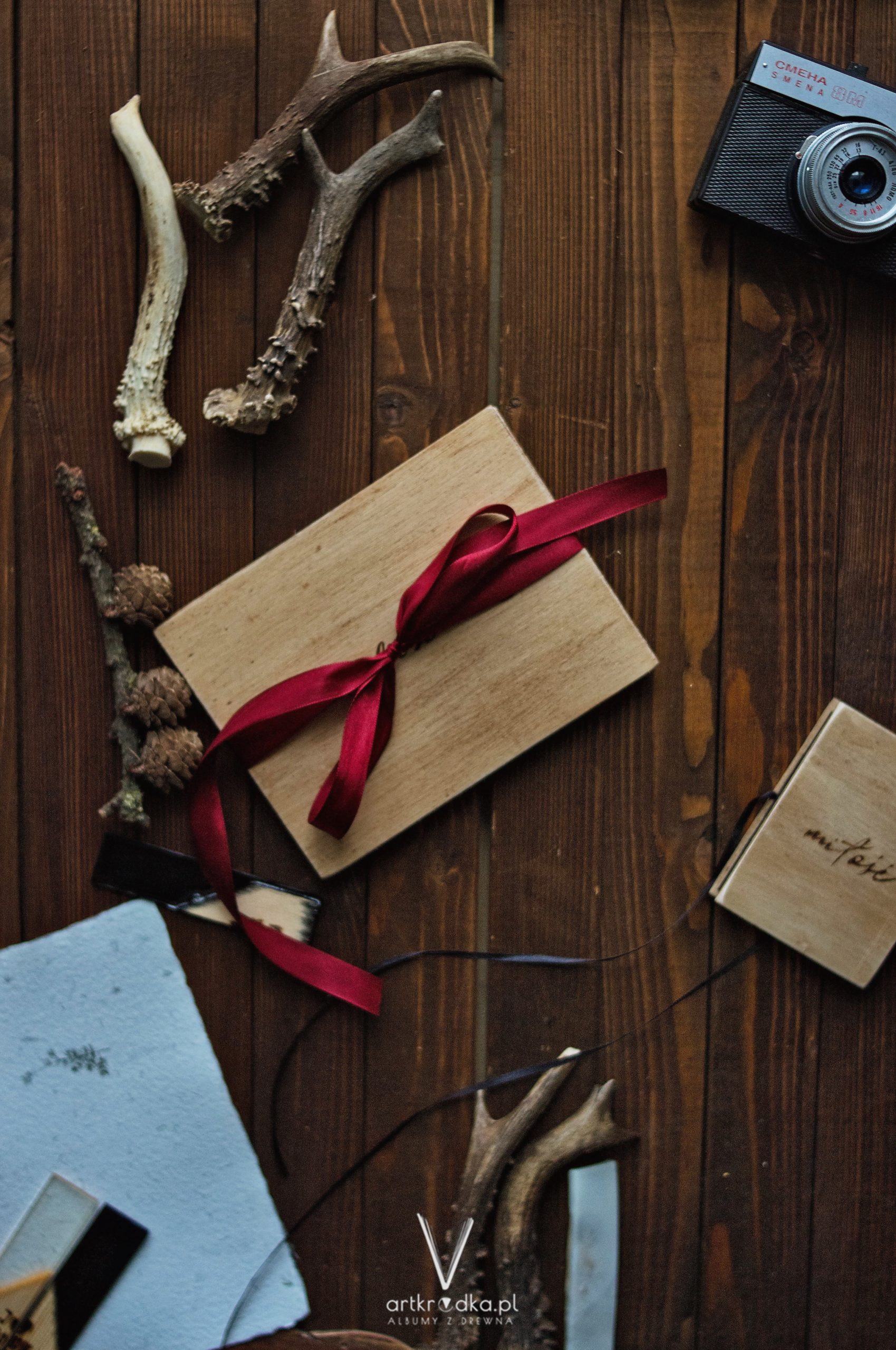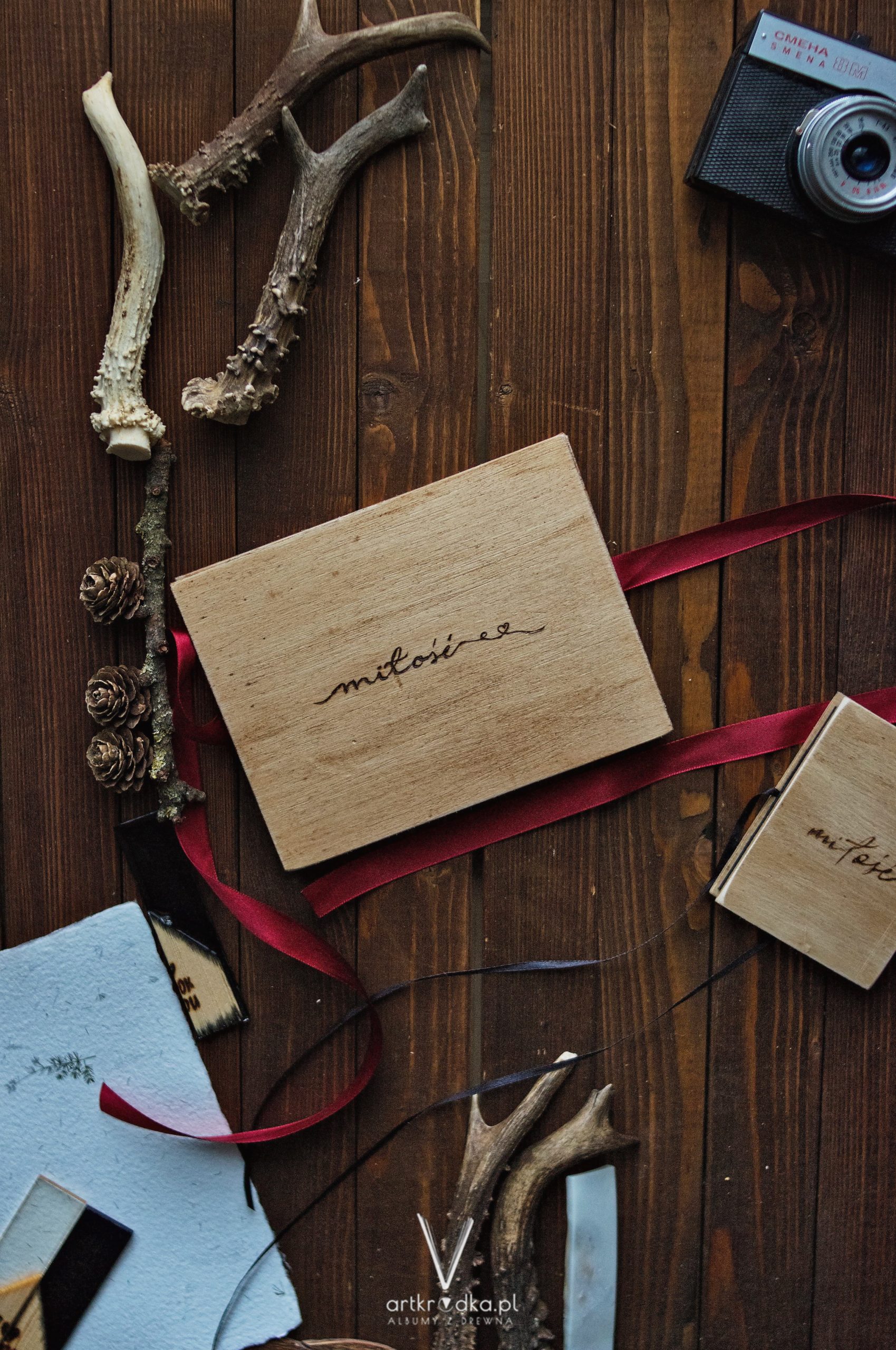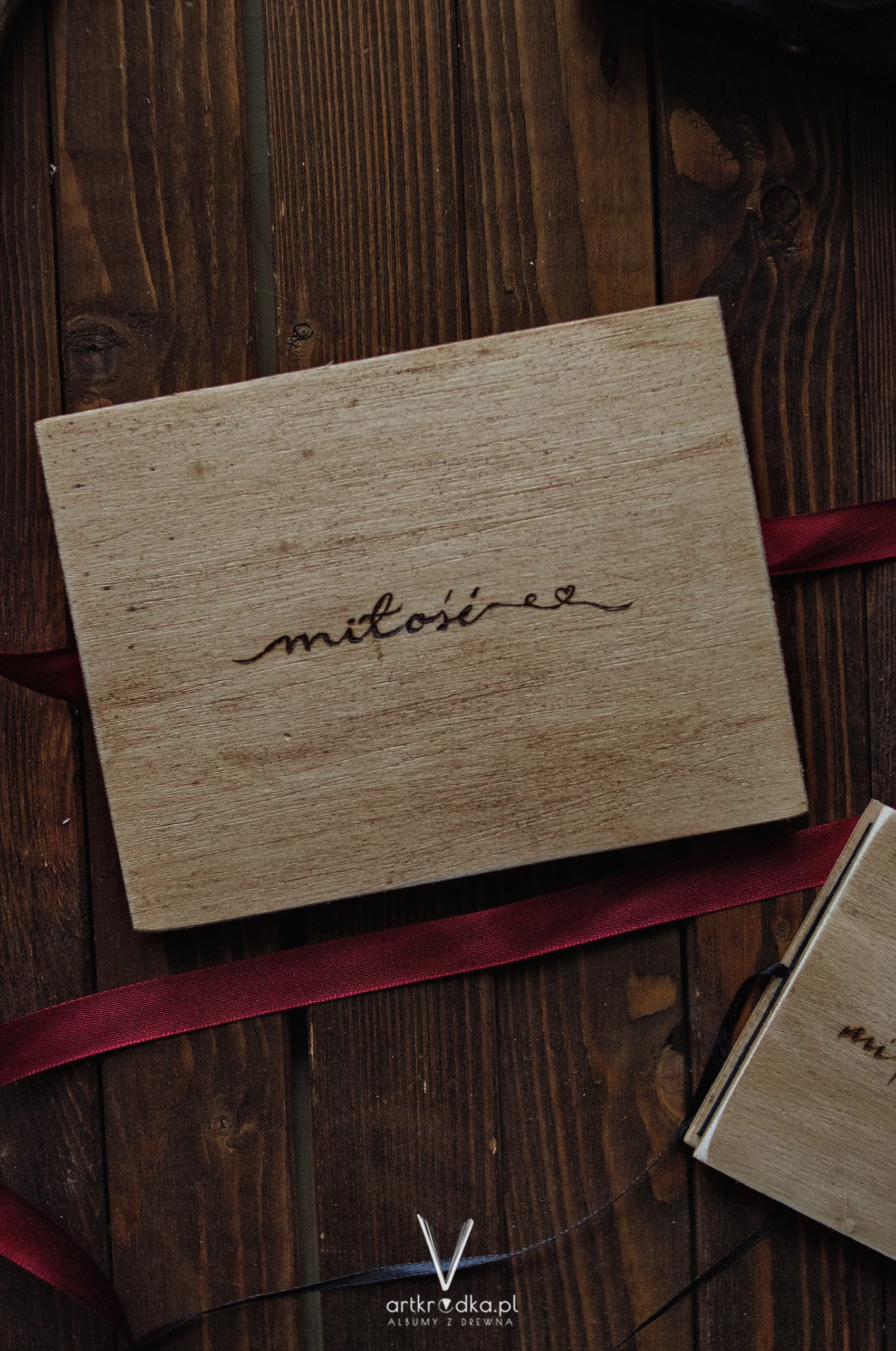 Album harmonijkowy w drewnianej oprawie, z ręcznie wypalanym napisem MIŁOŚĆ. Zawiązywany bordową wstążką.