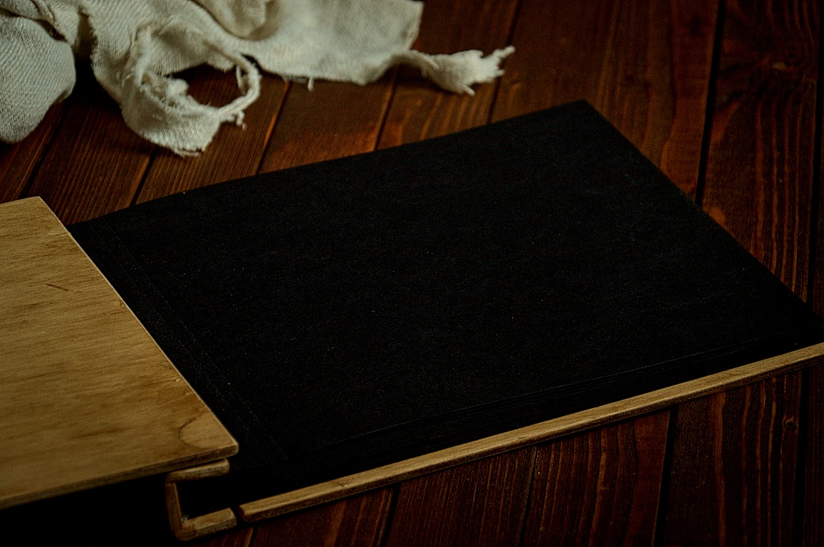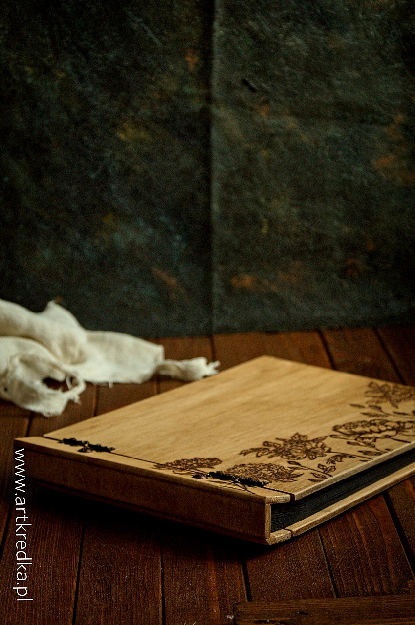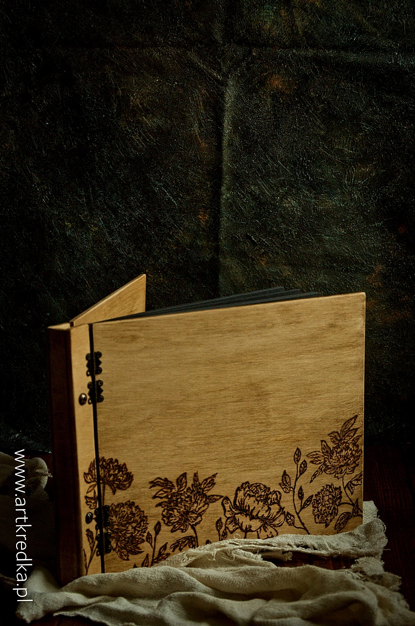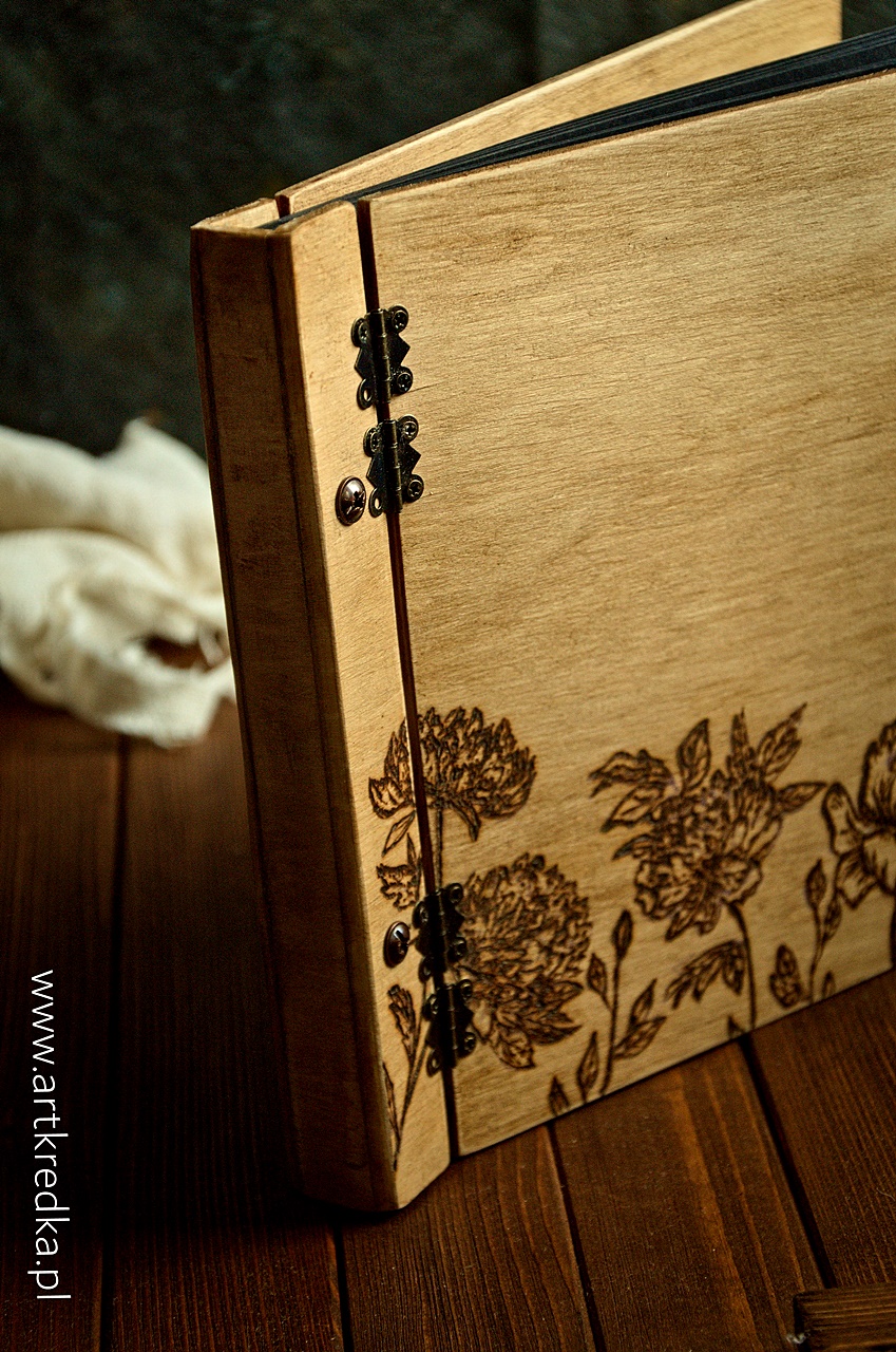 Album w drewnianej oprawie z ręcznie wypalanymi peoniami na okładce.