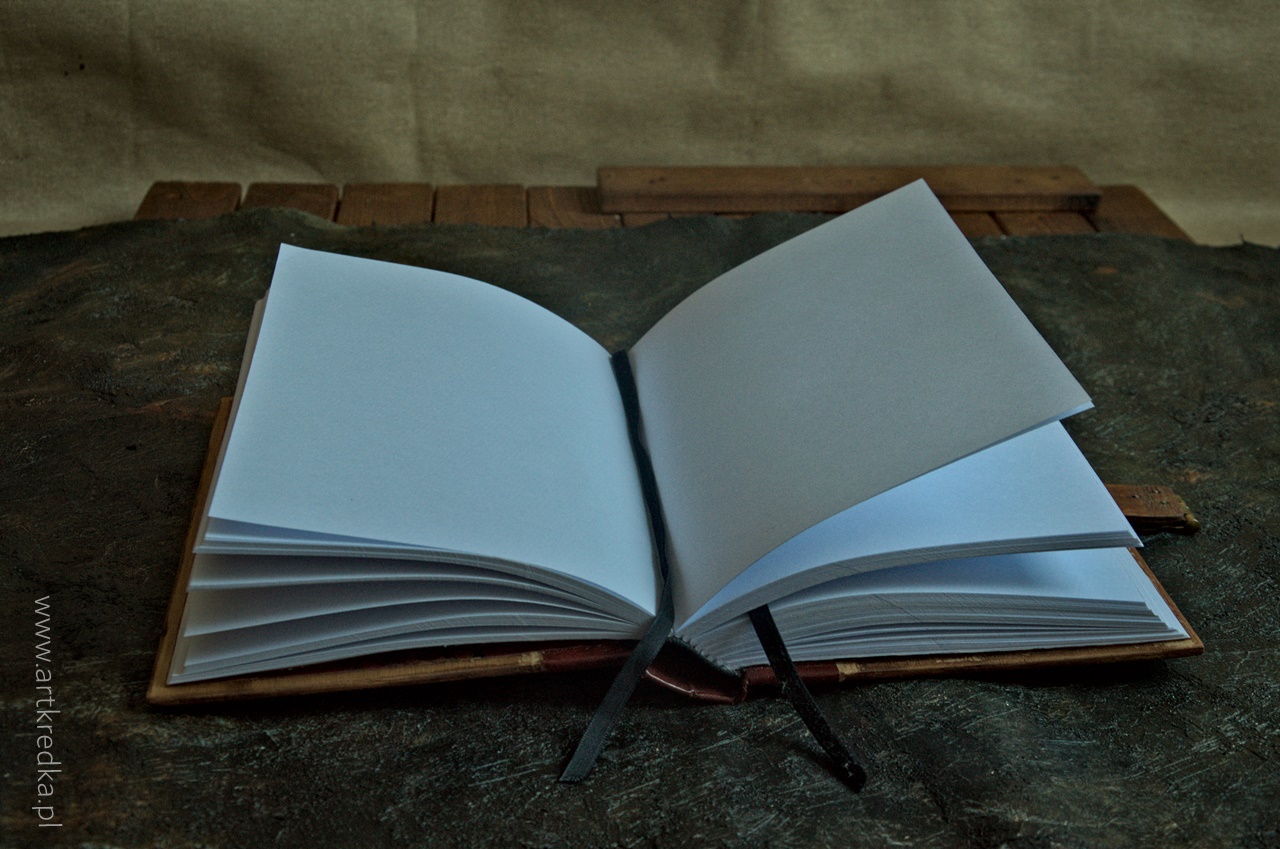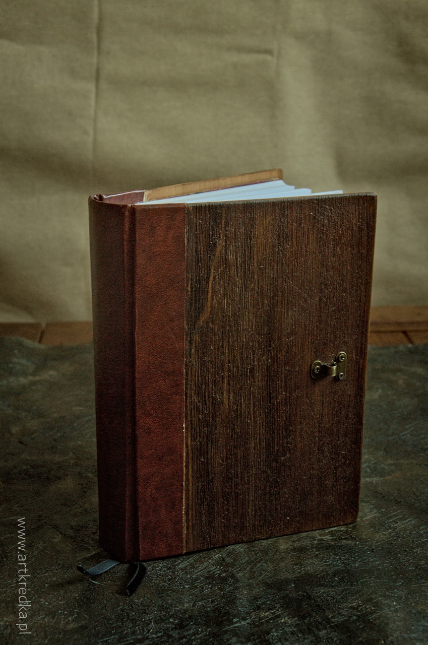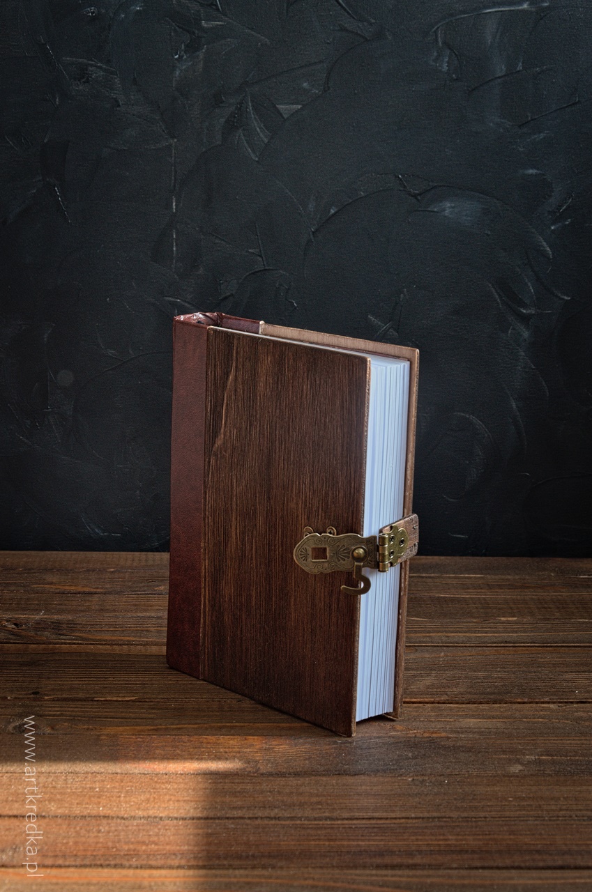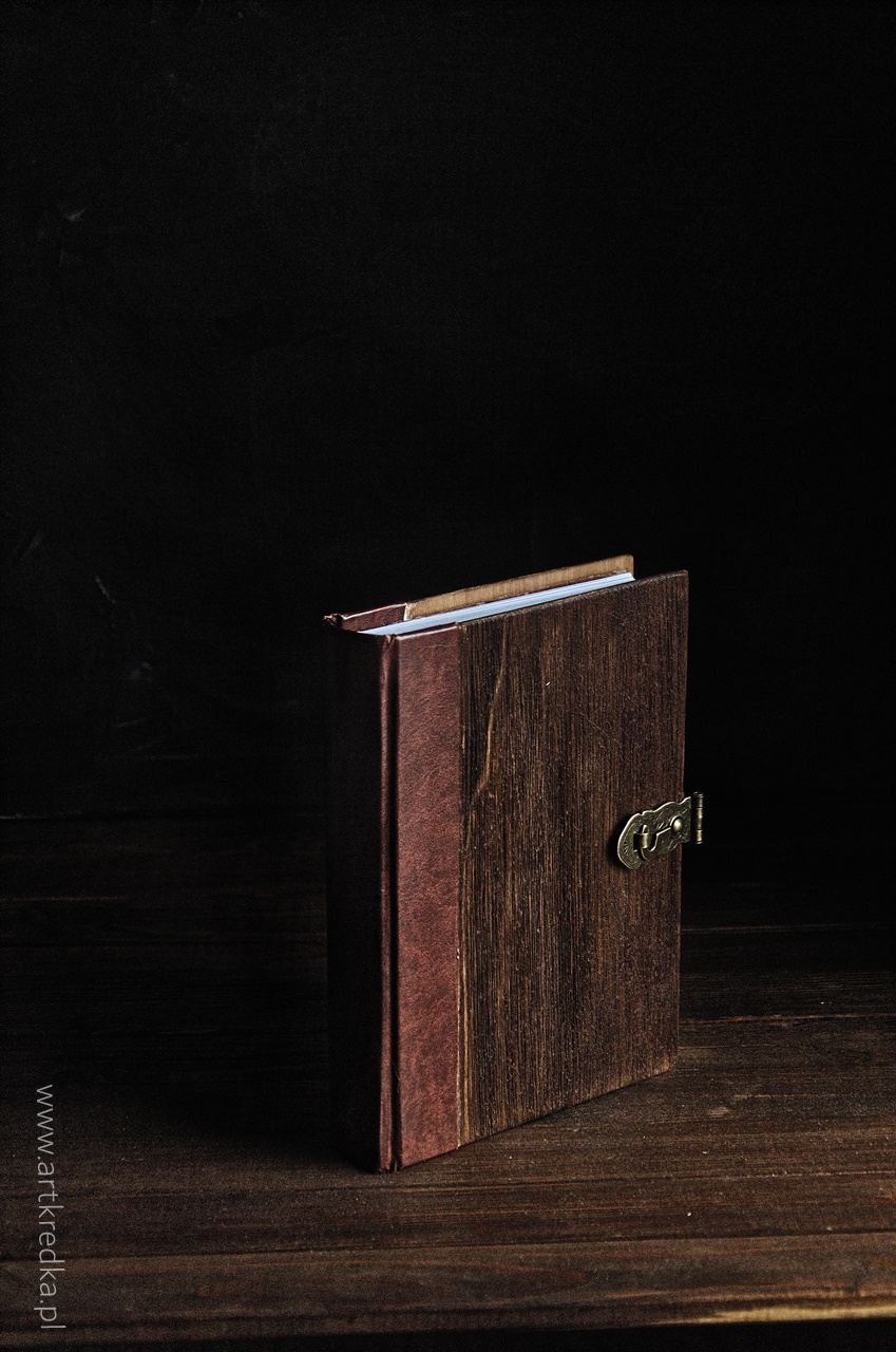Ręcznie szyty notes w drewnianej, mocno postarzanej oprawie.
