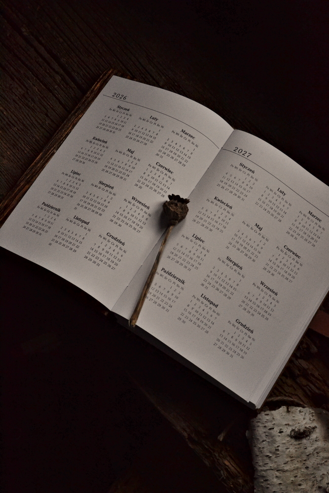 Kalendarz został zszyty szwem koptyjskim, co nie tylko zapewnia trwałość, ale także pozwala mu rozkładać się całkowicie na płasko. Dzięki temu pisanie jest niezwykle wygodne – niezależnie od tego, czy robisz szybkie notatki, planujesz dzień, czy tworzysz dłuższe wpisy.
