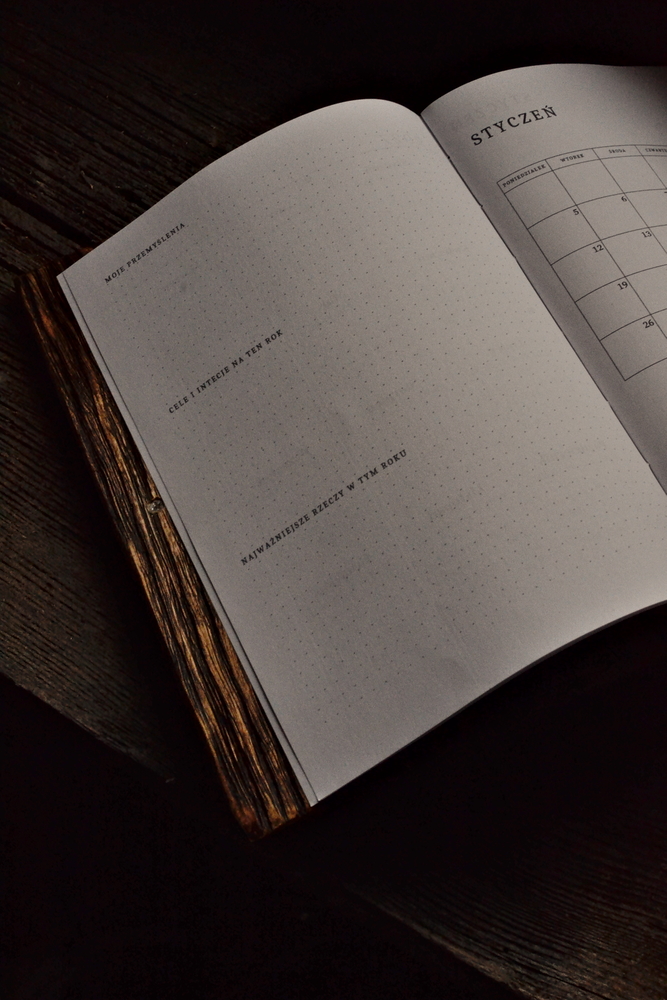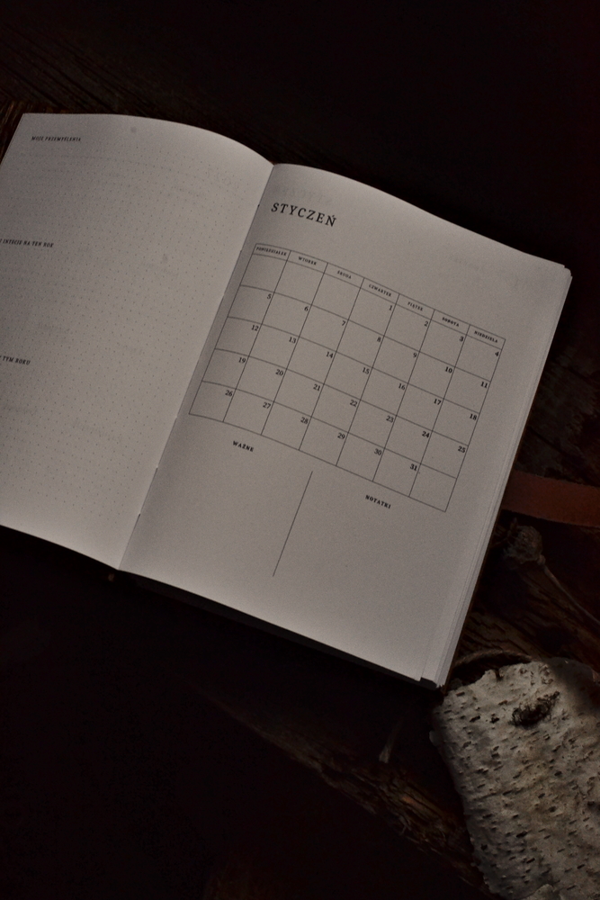 W środku znajdziesz cienki sznureczek – zakładkę, który pomaga łatwo wracać do aktualnego dnia i planów.