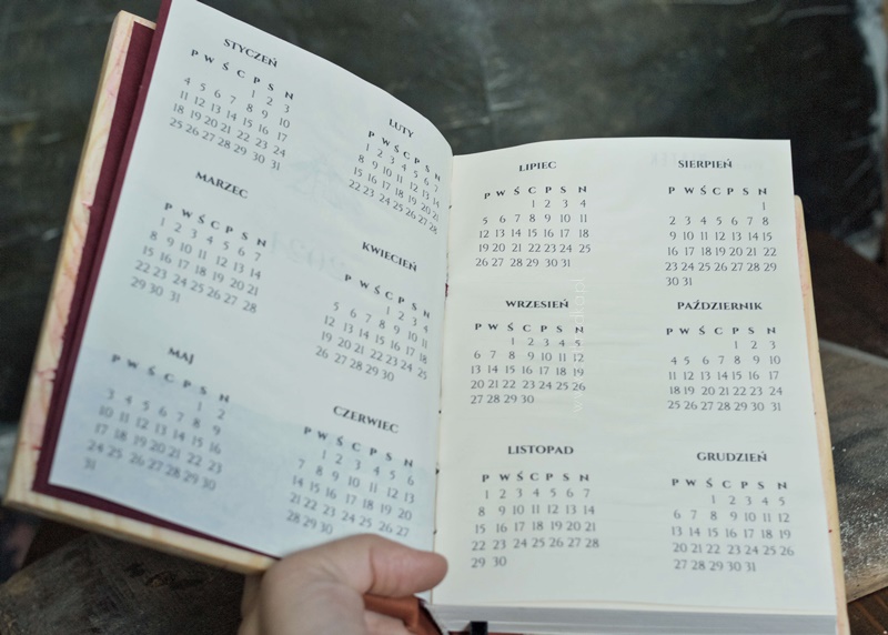 Całość została zszyta ręcznie. Projekt kalendarza również jest autorski.