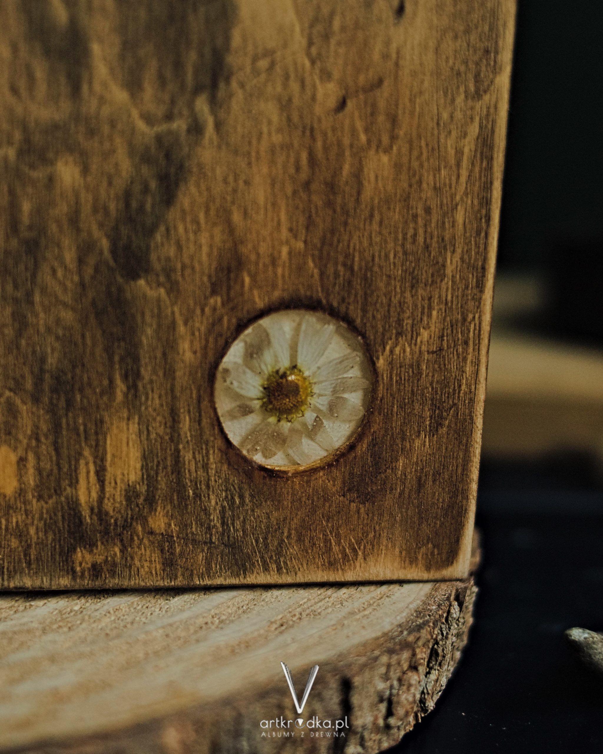 “Karmelowe lato” to notatnik w drewnianej oprawie z rumiankiem w żywicy.