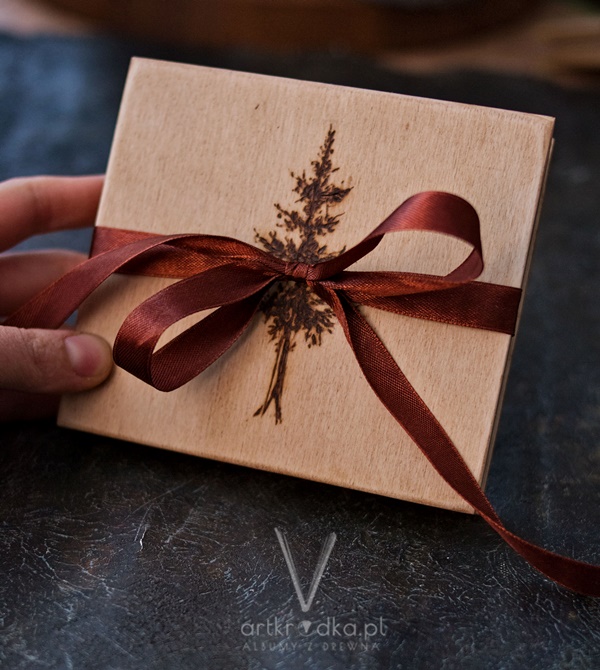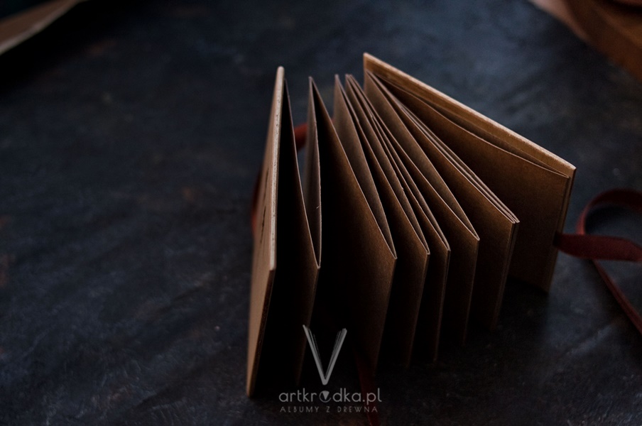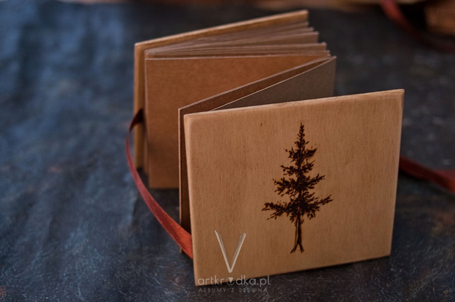 Album harmonijkowy w drewnianej oprawie, z ręcznie wypalanymi drzewami. Zawiązywany brązową wstążką.