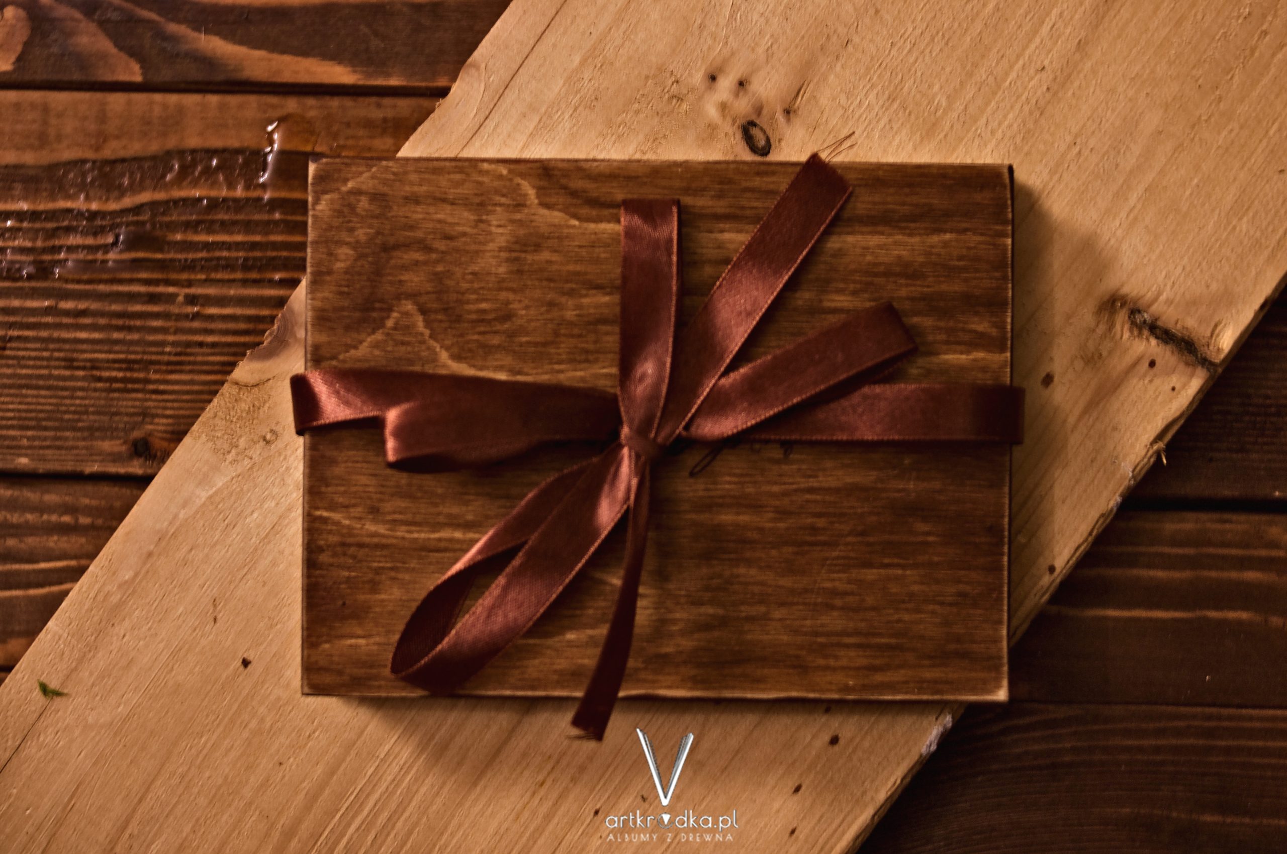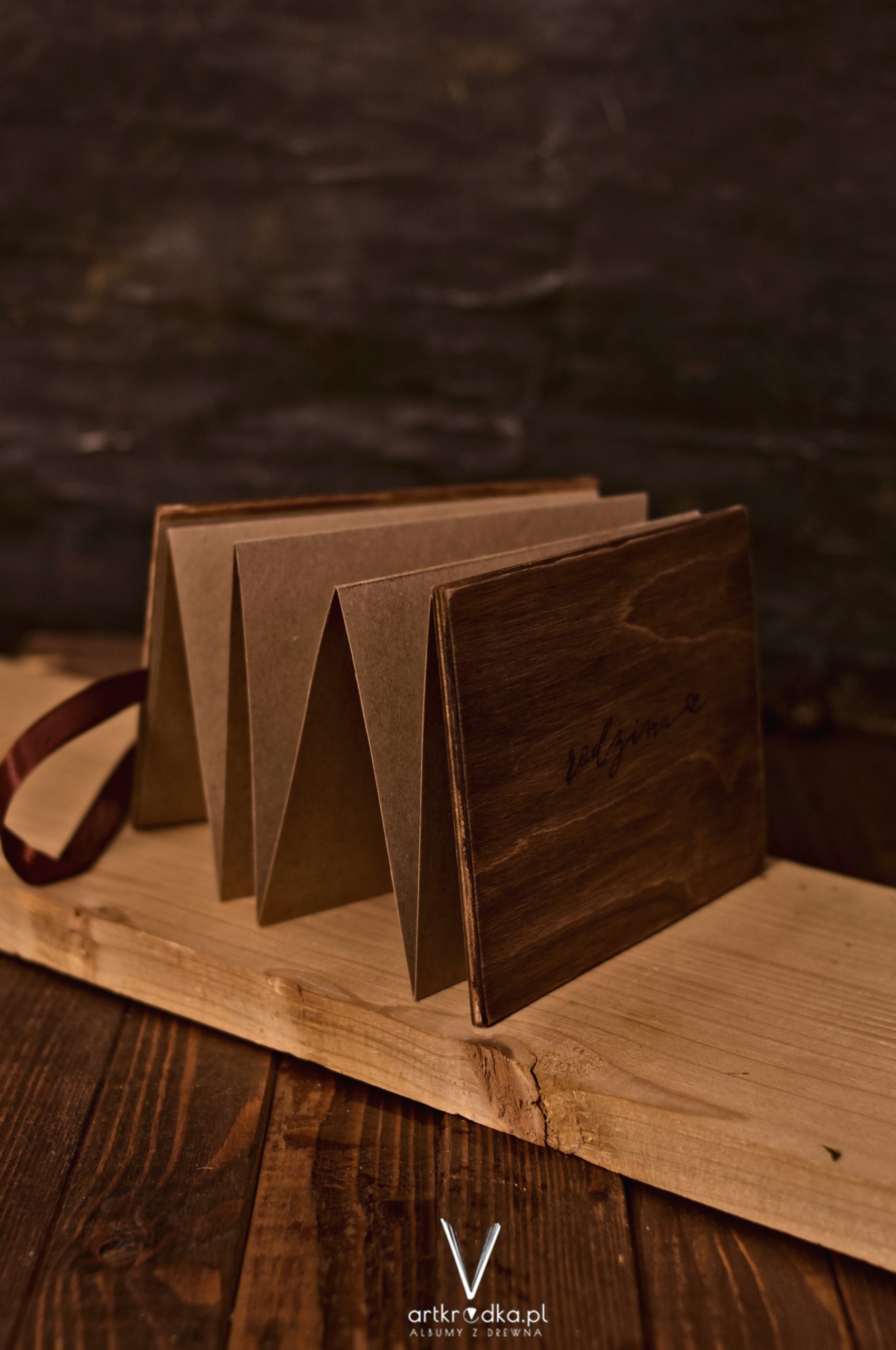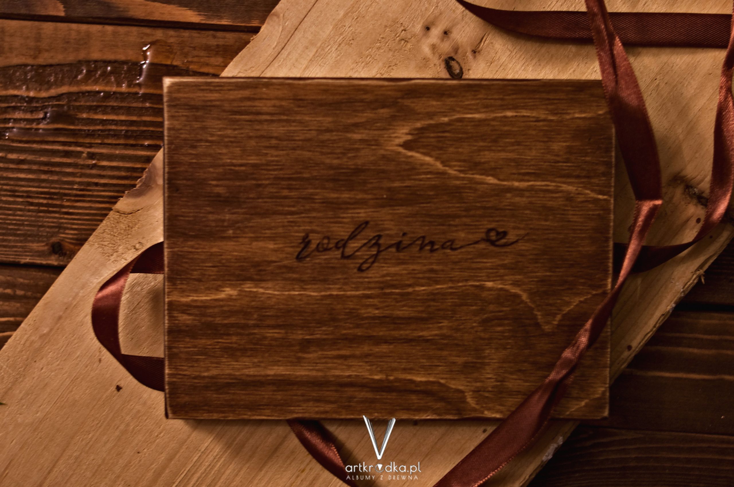 Album harmonijkowy w drewnianej oprawie, z ręcznie wypalanym napisemRODZINA. Zawiązywany brązową wstążką.