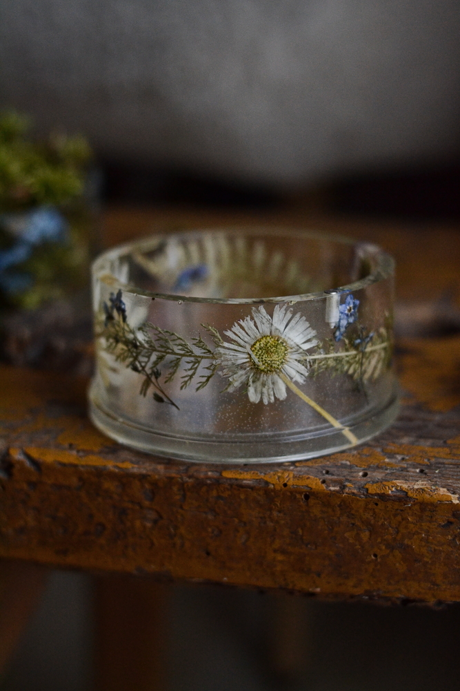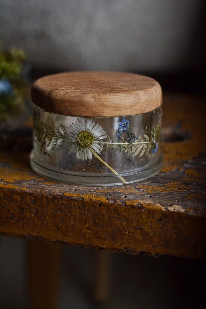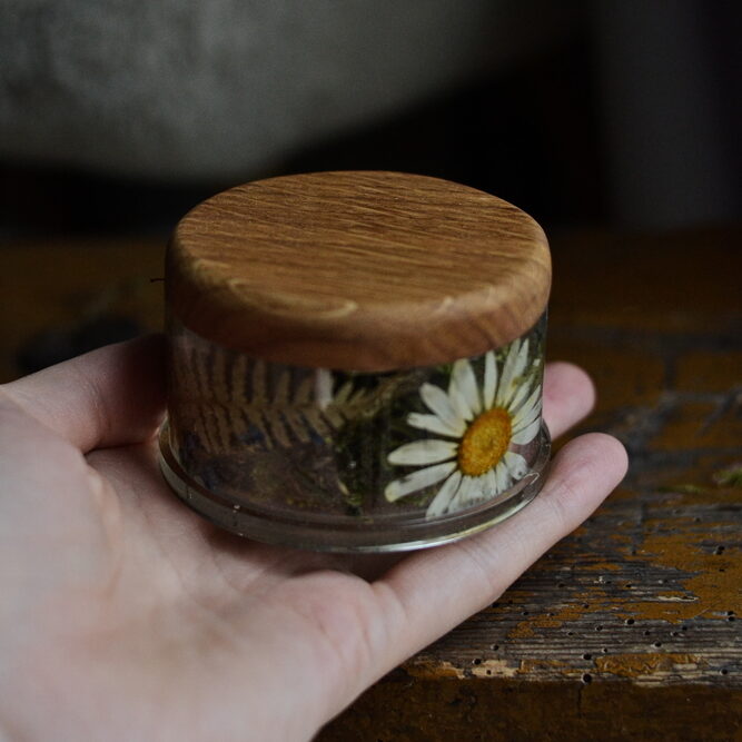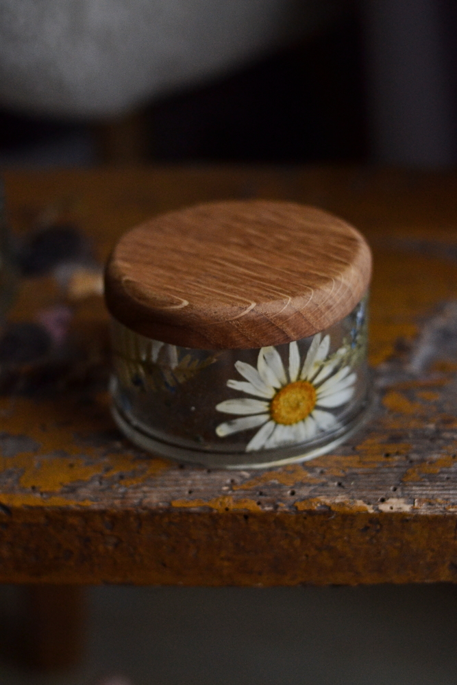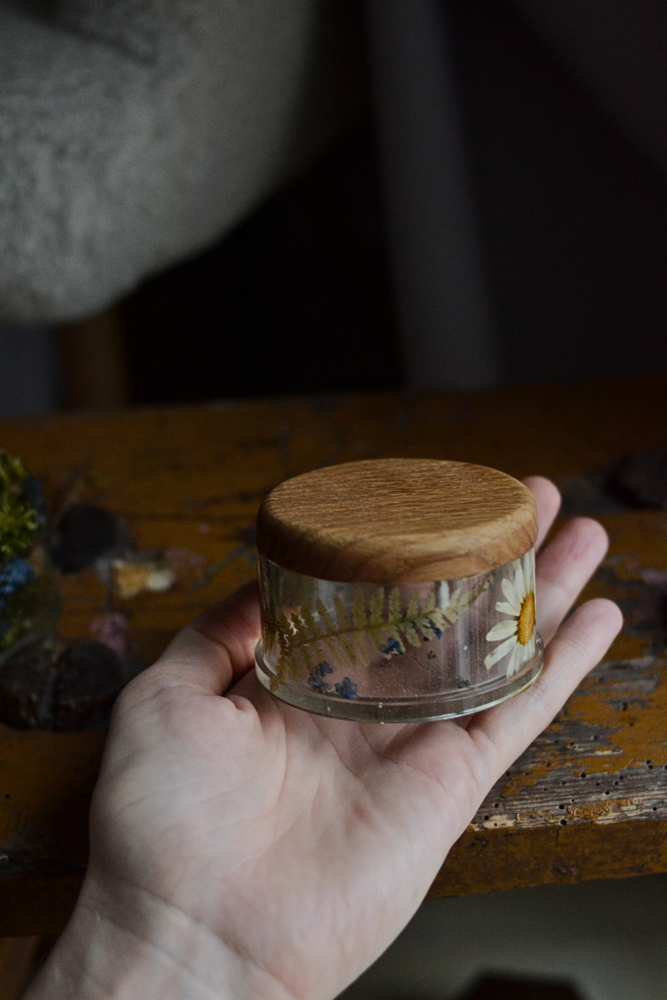 Okrągły korpus pudełka jest przejrzystą kapsułą czasu. W żywicy epoksydowej zatopiliśmy kompozycję prawdziwych, suszonych kwiatów łąkowych: