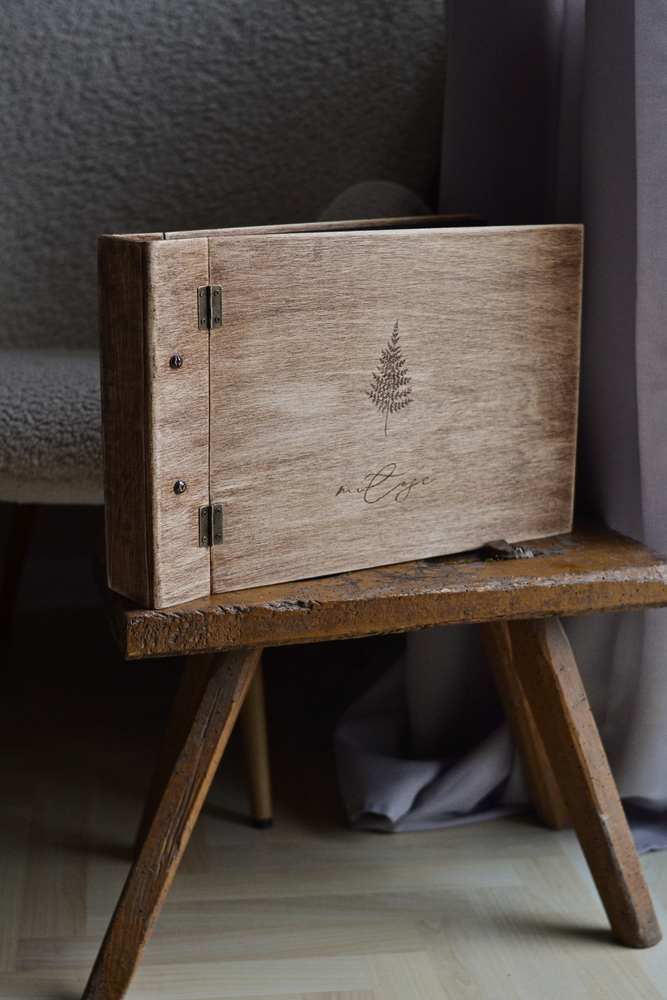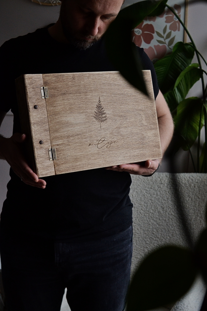Album standardowo zdobi piękny, ręcznie wypalony motyw paproci oraz elegancki napis “miłość”. Jednak oferujemy pełną możliwość dodania własnego napisu – imion, daty ślubu lub innej ważnej sentencji, którą umieścimy np. pod napisem “miłość” lub nad paprotką. Dzięki temu album staje się jedyną w swoim rodzaju, personalizowaną pamiątką.