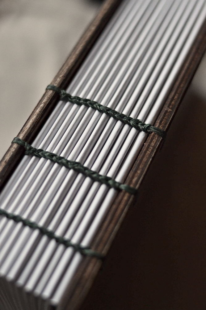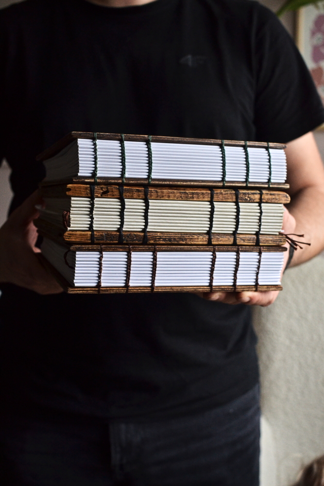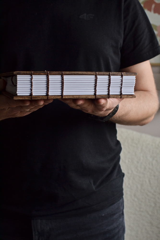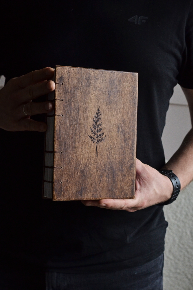 - Okładka: Twarda, drewniana okładka z postarzanej sklejki.