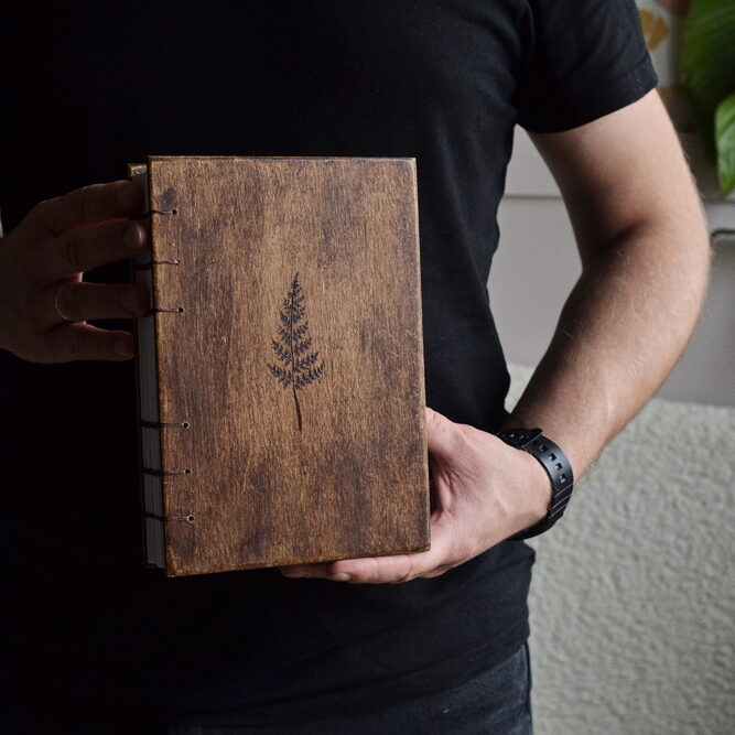 - Wypalana Paproć: Okładka z postarzanej sklejki została ozdobiona ręcznie wypalanym motywem paproci. Ten grawer jest trwałym symbolem natury, siły i wiecznej pamięci.