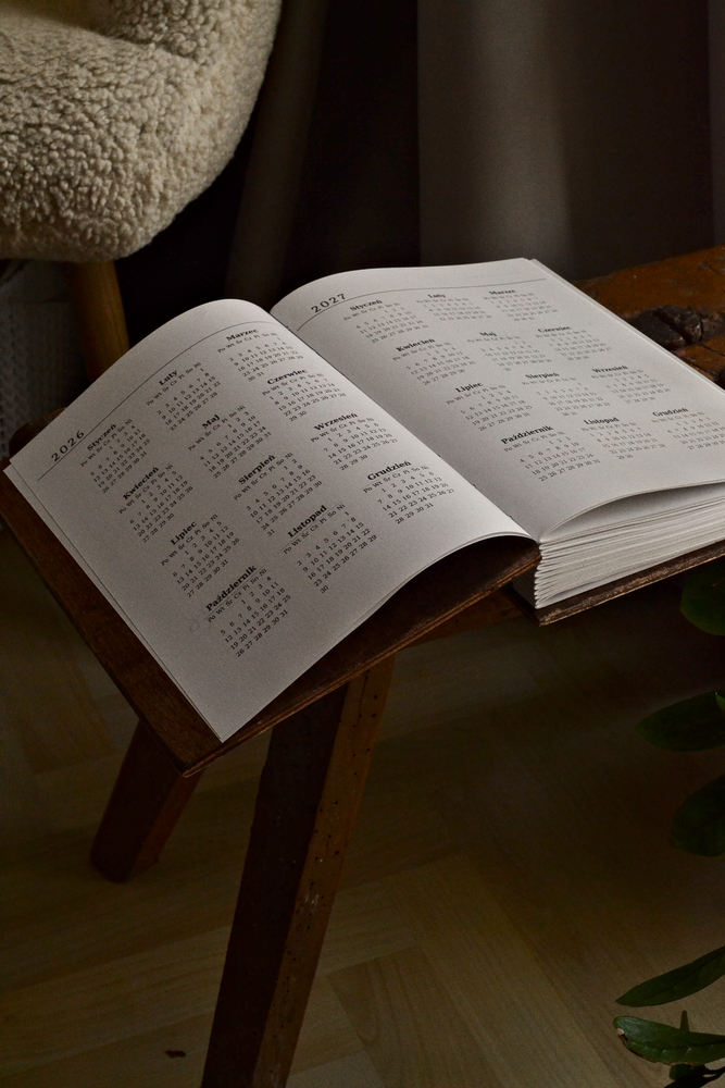 - Szycie Koptyjskie: Kalendarz został zszyty ozdobnym, a zarazem niezwykle trwałym szyciem koptyjskim. Ten typ oprawy jest nie tylko piękny, ale przede wszystkim umożliwia otwarcie kalendarza na płasko w każdym miejscu, co maksymalizuje komfort pisania.