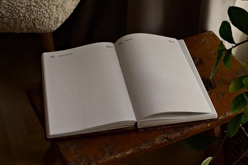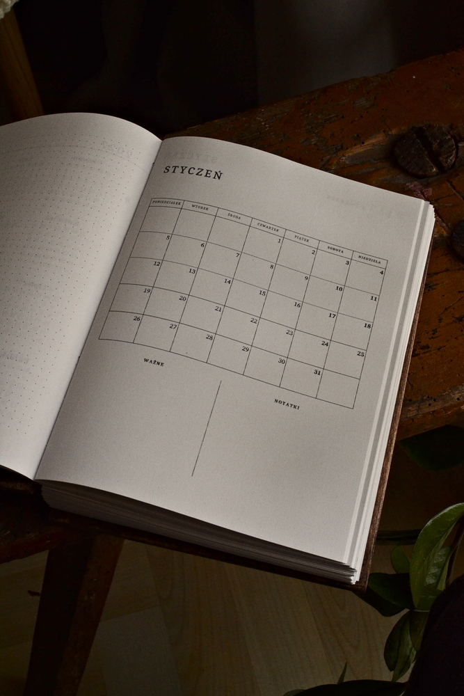 Układ Dzienny: Kalendarz ma przejrzysty układ dziennym. Idealny do prowadzenia Bullet Journal, szkicowania i swobodnych notatek.