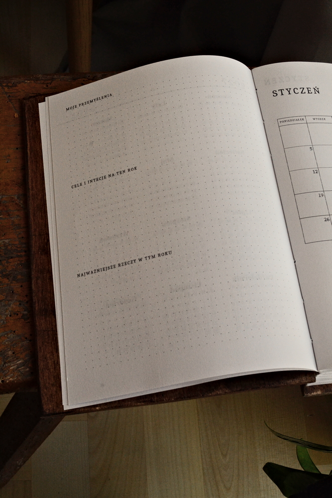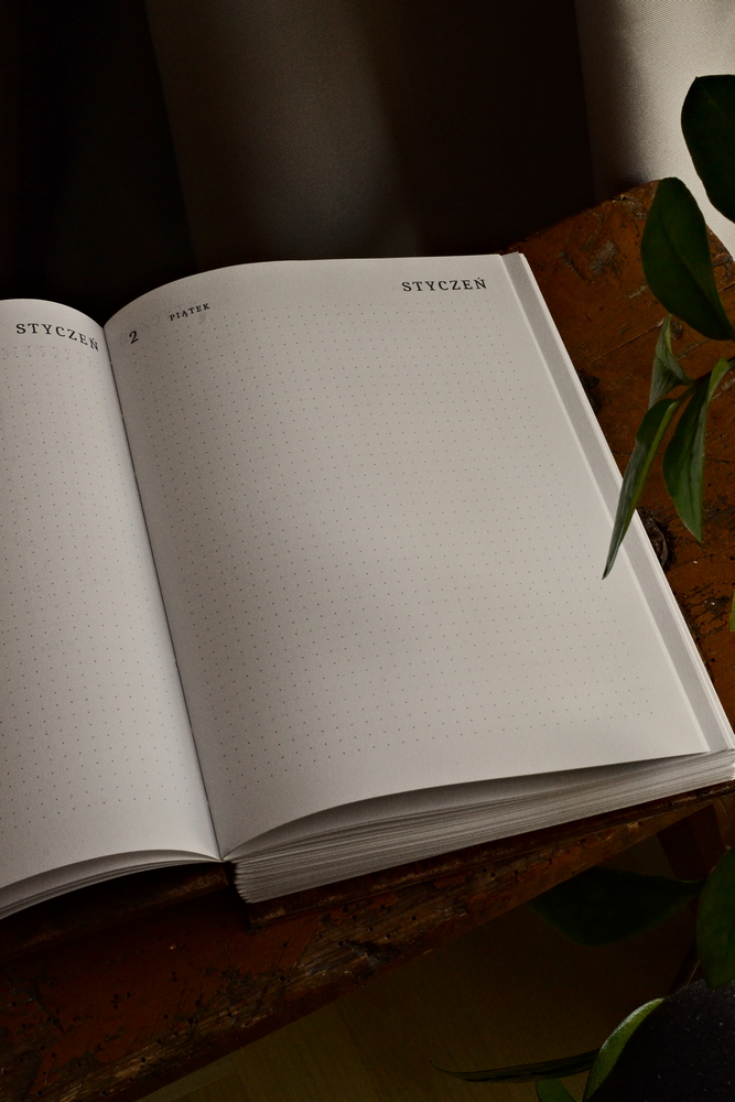 - Układ Dzienny: Każdy dzień to osobna strona. Na górze wygodnie zaznaczona data i dzień tygodnia, na dole zaś wykropkowane strony, idealne na notatki, szkice czy listy zadań.