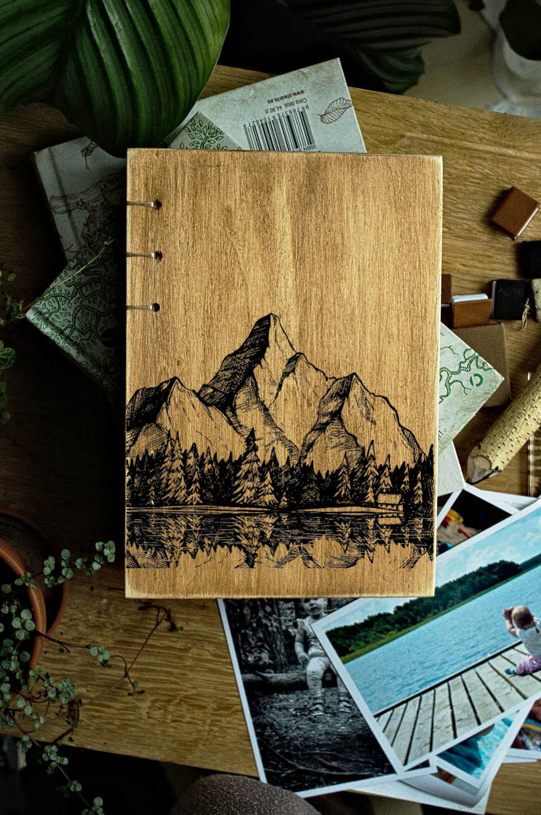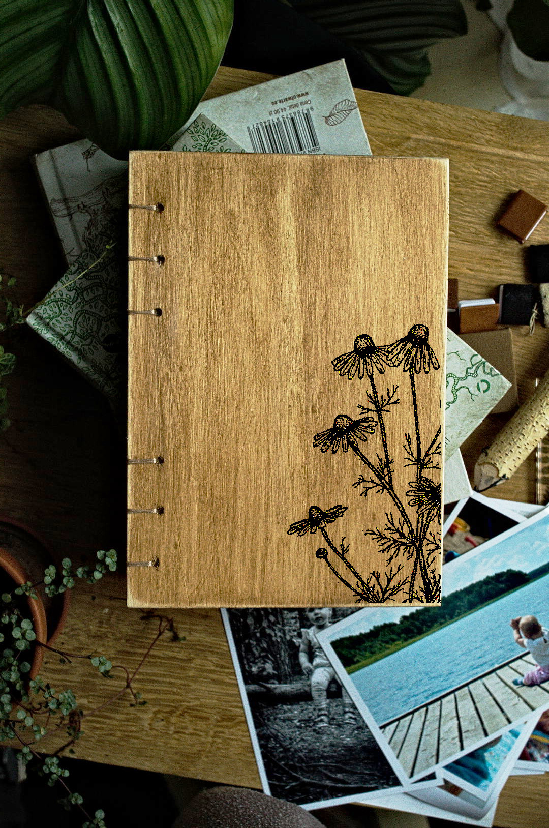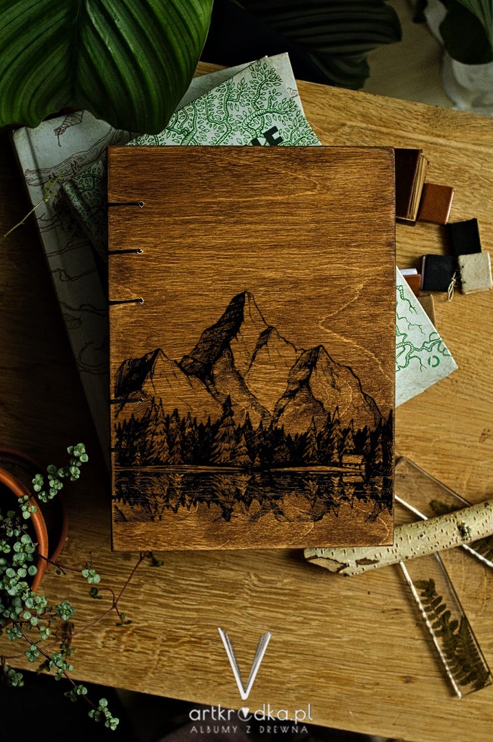 Personalizowany drewniany kalendarz książkowy został wykonany ręcznie. Projekt w układzie dziennym, format A5.
