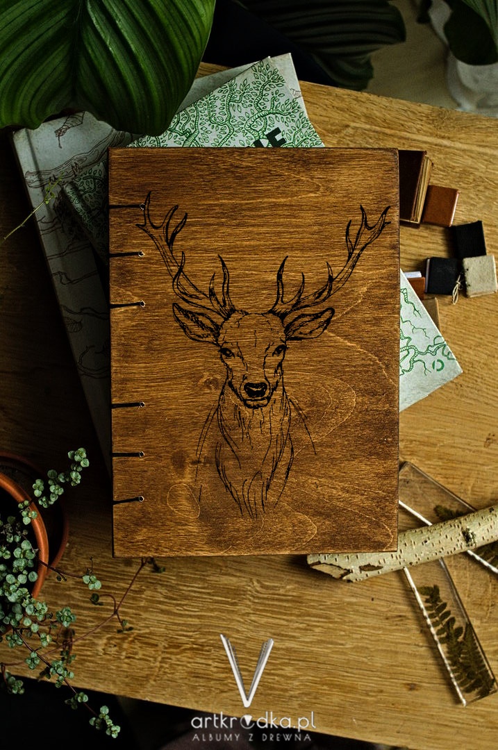 Oprawa drewniana. Lekka sklejka została postarzona i zabezpieczona woskiem.