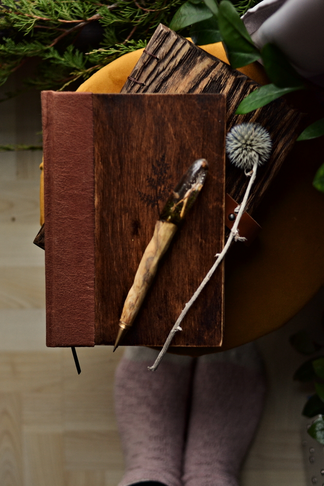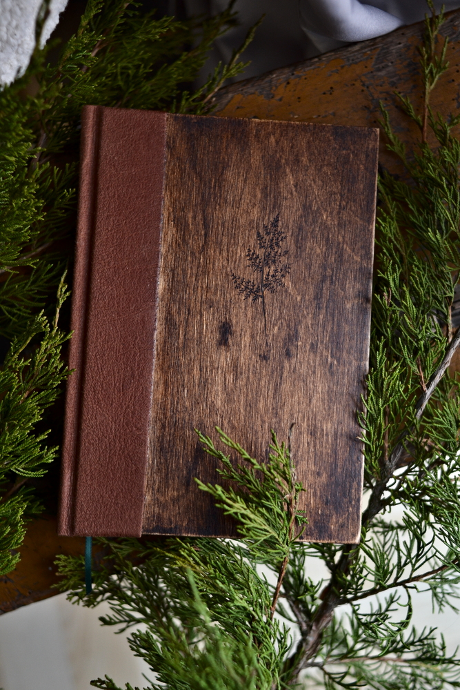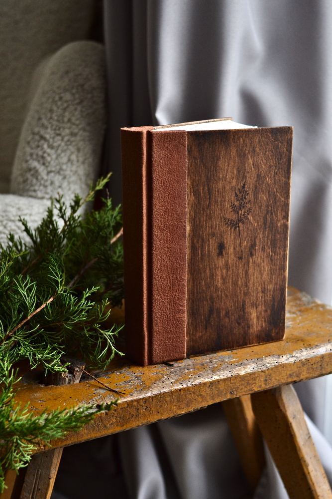 Drewniana okładka jest ręcznie postarzona i woskowana, co podkreśla strukturę słojów i nadaje każdemu egzemplarzowi unikatowy charakter. Na grzbiecie użyłam karmelowej washpapy — trwałego, wegańskiego materiału o skórzanej fakturze, który zyskuje charakter z upływem czasu.