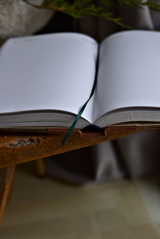 Kalendarz zszywany i oprawiany ręcznie. Rozkłada się na płasko — idealne do pisania i wygodnego przeglądania.