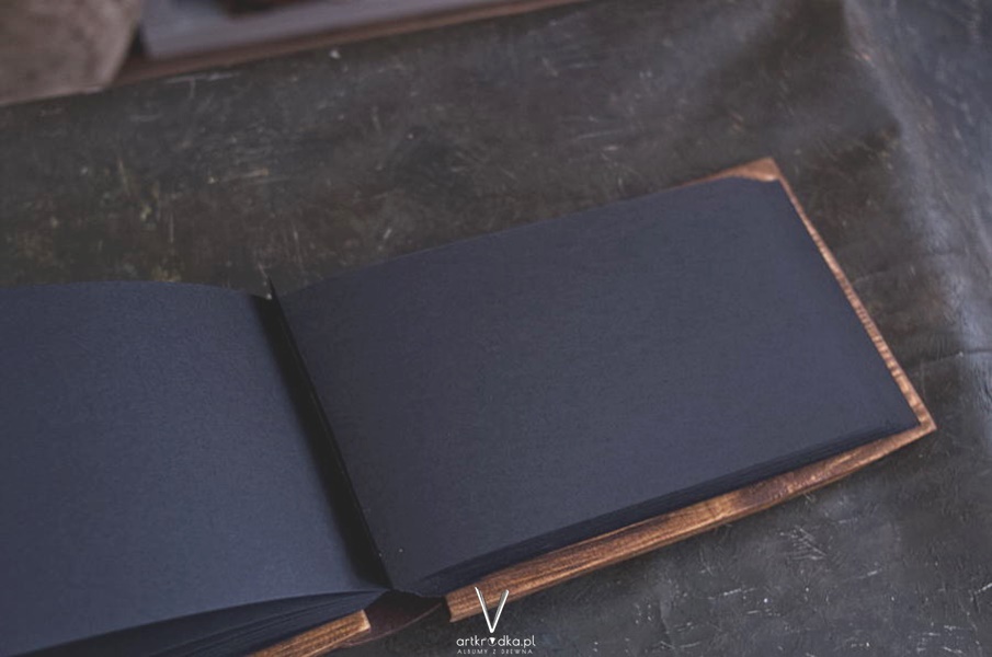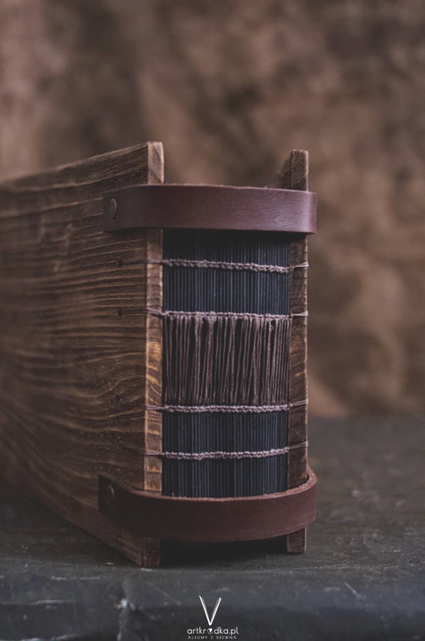Album w drewnianej oprawie wykonanej z litego drewna. Drewno zostało postarzone i zabezpieczone.