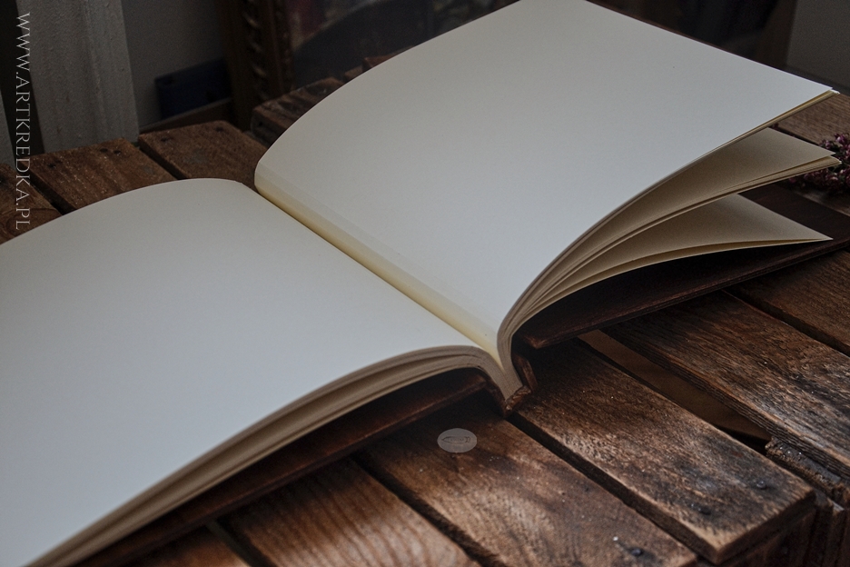 Księga zawiera karty o gramaturze 160 g/m2 w kolorze kremowym, w całości wykonana jest ręcznie.