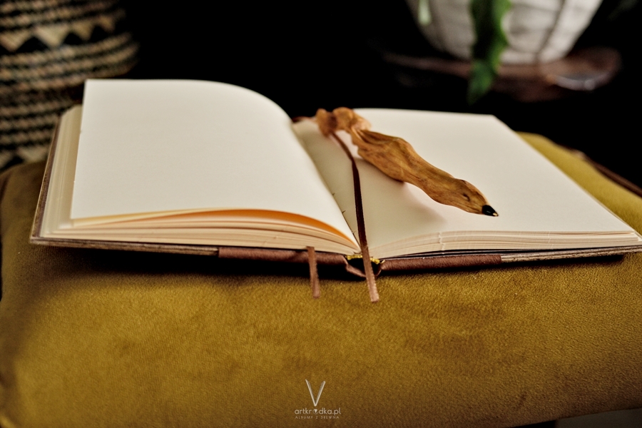 Dekoracje na okładce zostały ręcznie wypalone, środek ręcznie zszyty i oprawiony w ręcznie woskowane drewno.