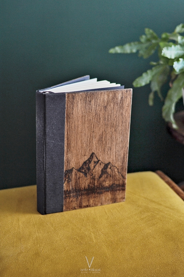 Personalizowany notatnik drewniany z górami, firmowy notatnik A5