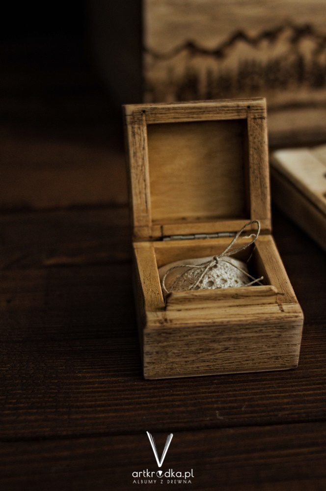 Drewniane, ręcznie postarzane pudełko na obrączki.